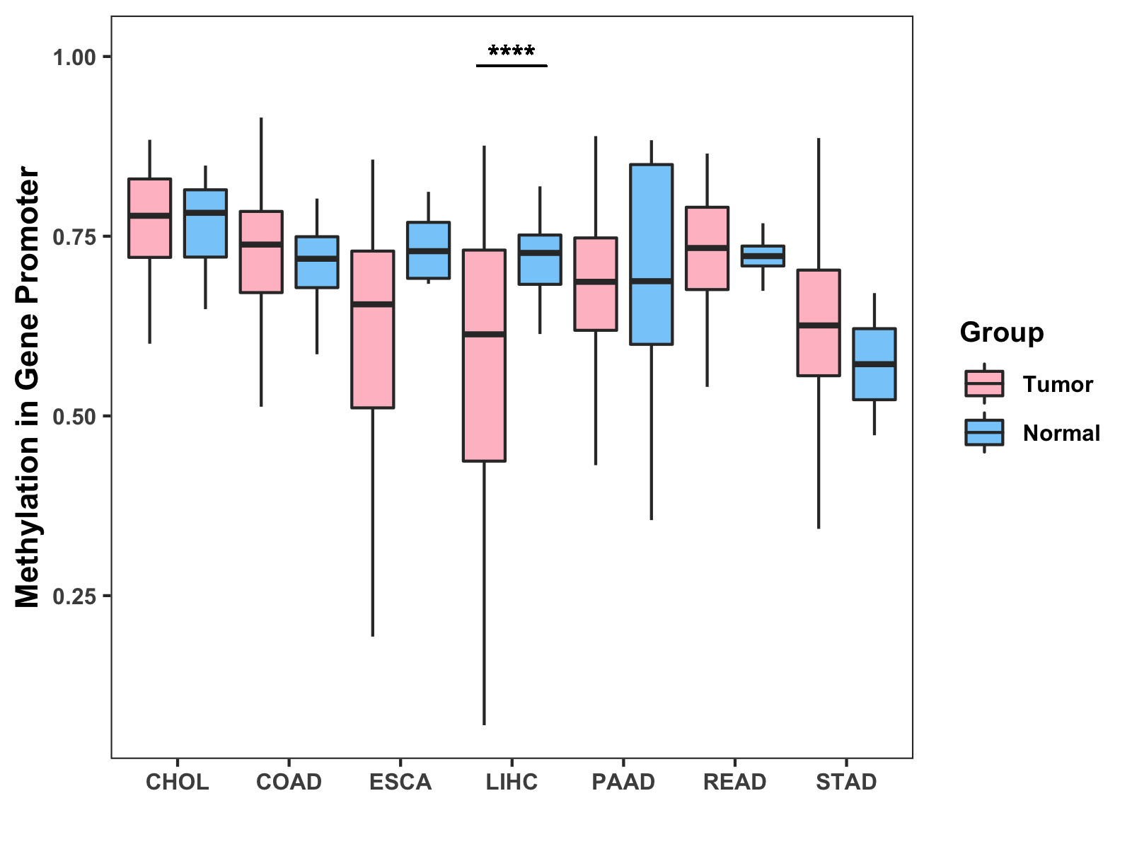 Boxplot of All Gastrointestinal Cancer ( * : 0.01-0.05 , ** : 0.005-0.01 , *** : 0.0001-0.005 , **** : < 0.0001 ) |