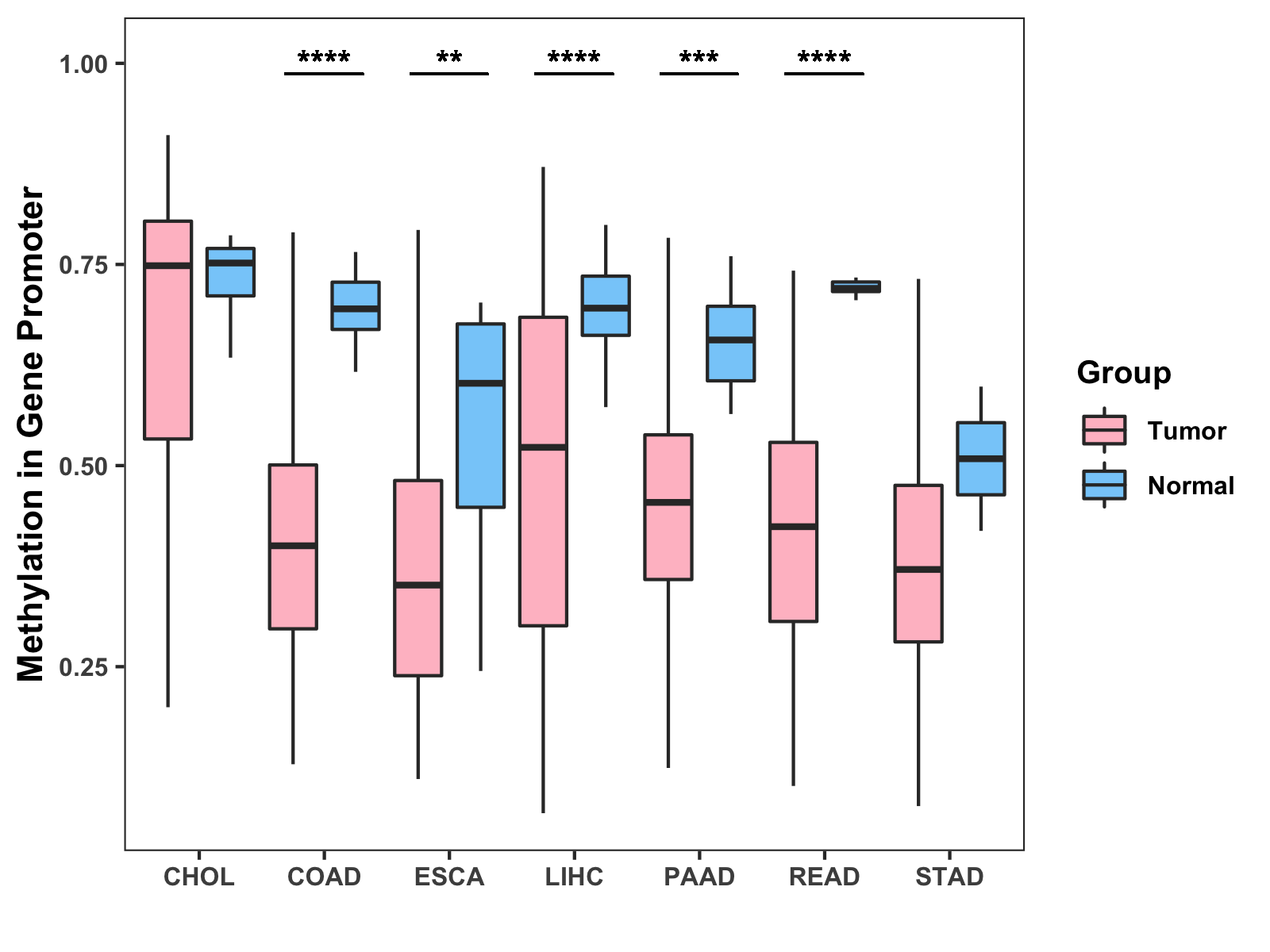 Boxplot of All Gastrointestinal Cancer ( * : 0.01-0.05 , ** : 0.005-0.01 , *** : 0.0001-0.005 , **** : < 0.0001 ) |