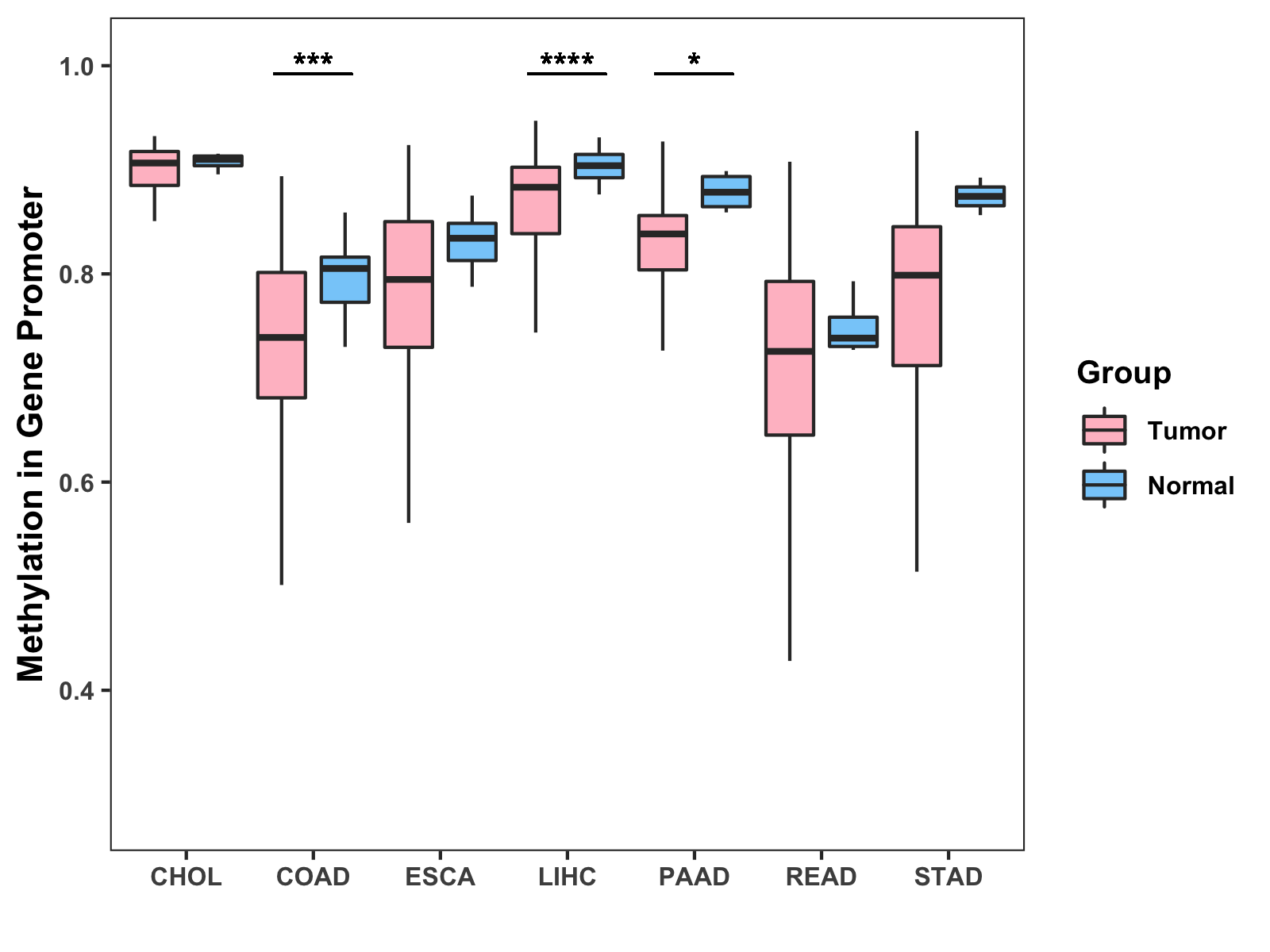 Boxplot of All Gastrointestinal Cancer ( * : 0.01-0.05 , ** : 0.005-0.01 , *** : 0.0001-0.005 , **** : < 0.0001 ) |