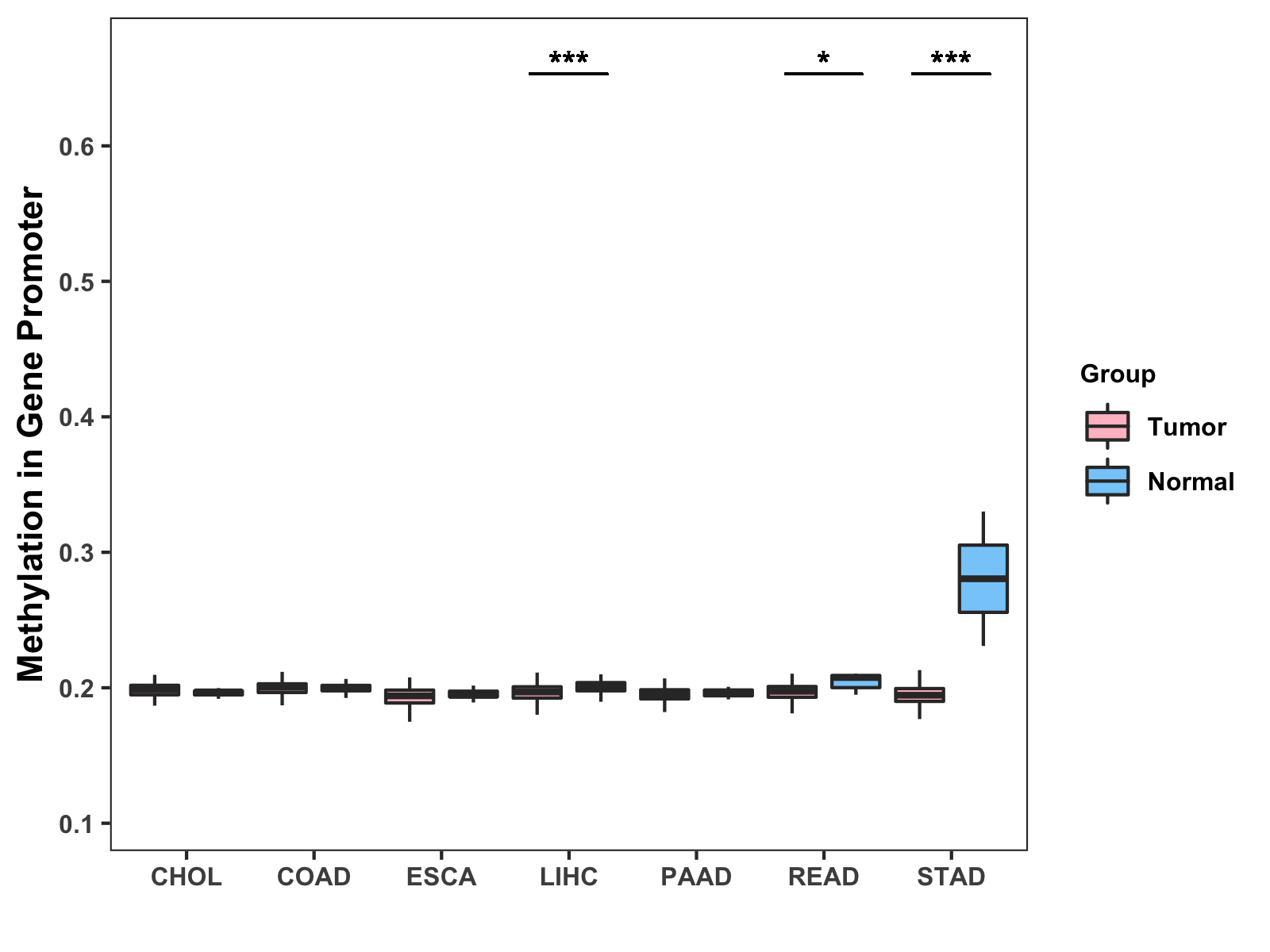 Boxplot of All Gastrointestinal Cancer ( * : 0.01-0.05 , ** : 0.005-0.01 , *** : 0.0001-0.005 , **** : < 0.0001 ) |