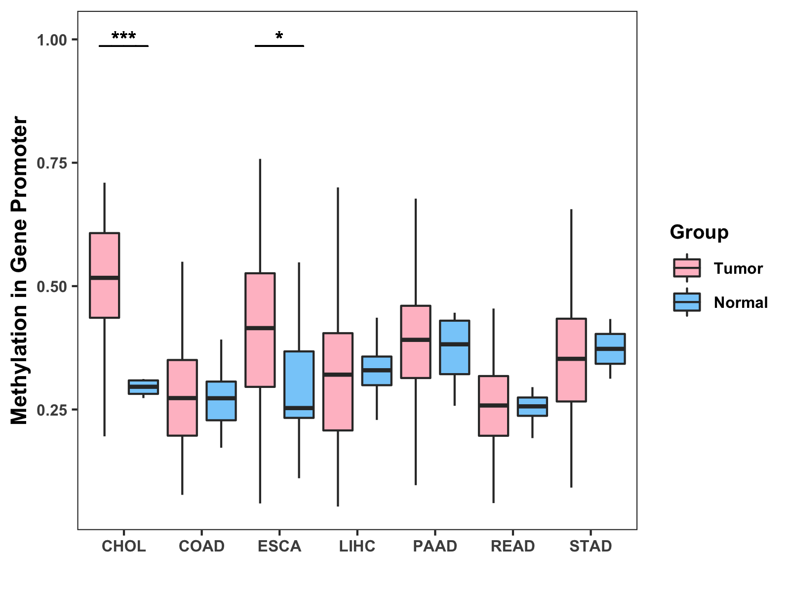 Boxplot of All Gastrointestinal Cancer ( * : 0.01-0.05 , ** : 0.005-0.01 , *** : 0.0001-0.005 , **** : < 0.0001 ) |