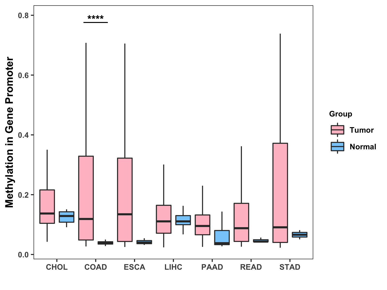 Boxplot of All Gastrointestinal Cancer ( * : 0.01-0.05 , ** : 0.005-0.01 , *** : 0.0001-0.005 , **** : < 0.0001 ) |