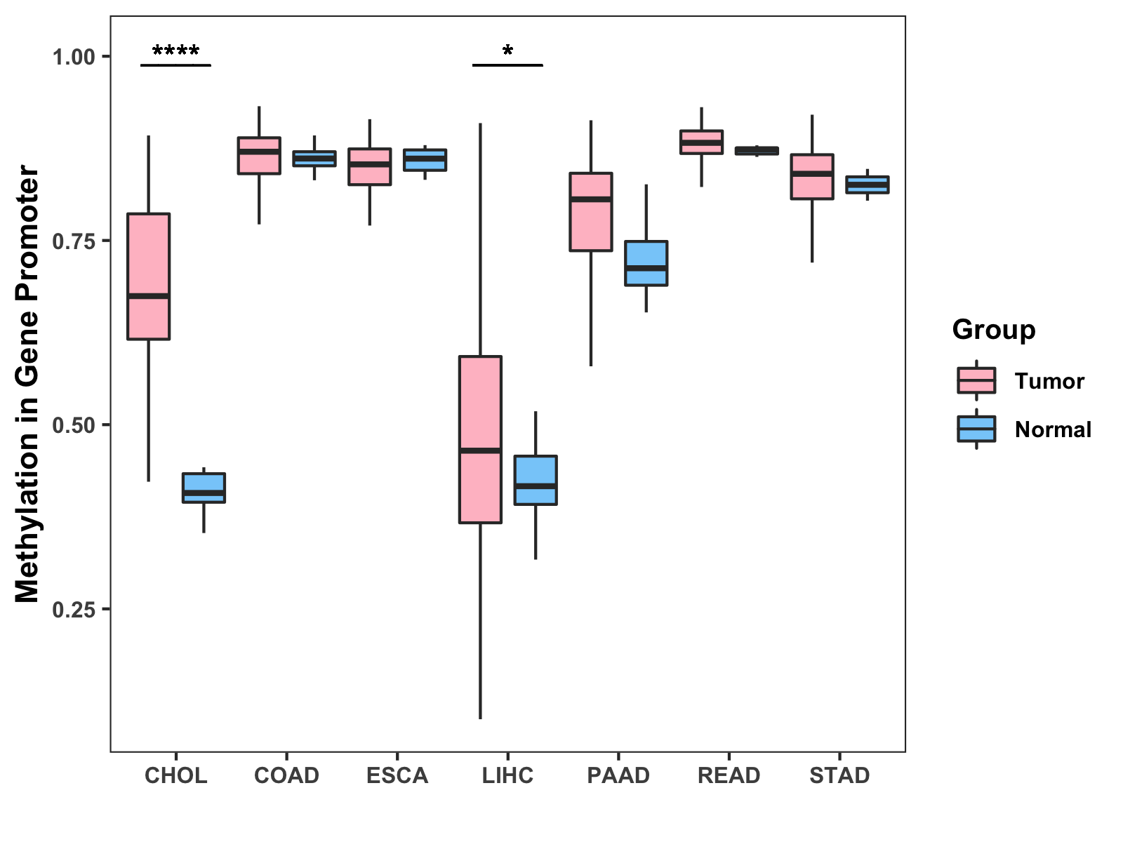 Boxplot of All Gastrointestinal Cancer ( * : 0.01-0.05 , ** : 0.005-0.01 , *** : 0.0001-0.005 , **** : < 0.0001 ) |
