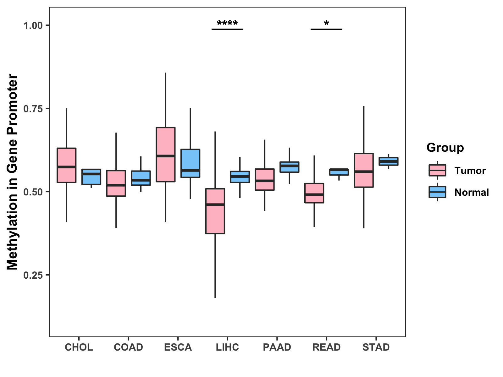 Boxplot of All Gastrointestinal Cancer ( * : 0.01-0.05 , ** : 0.005-0.01 , *** : 0.0001-0.005 , **** : < 0.0001 ) |