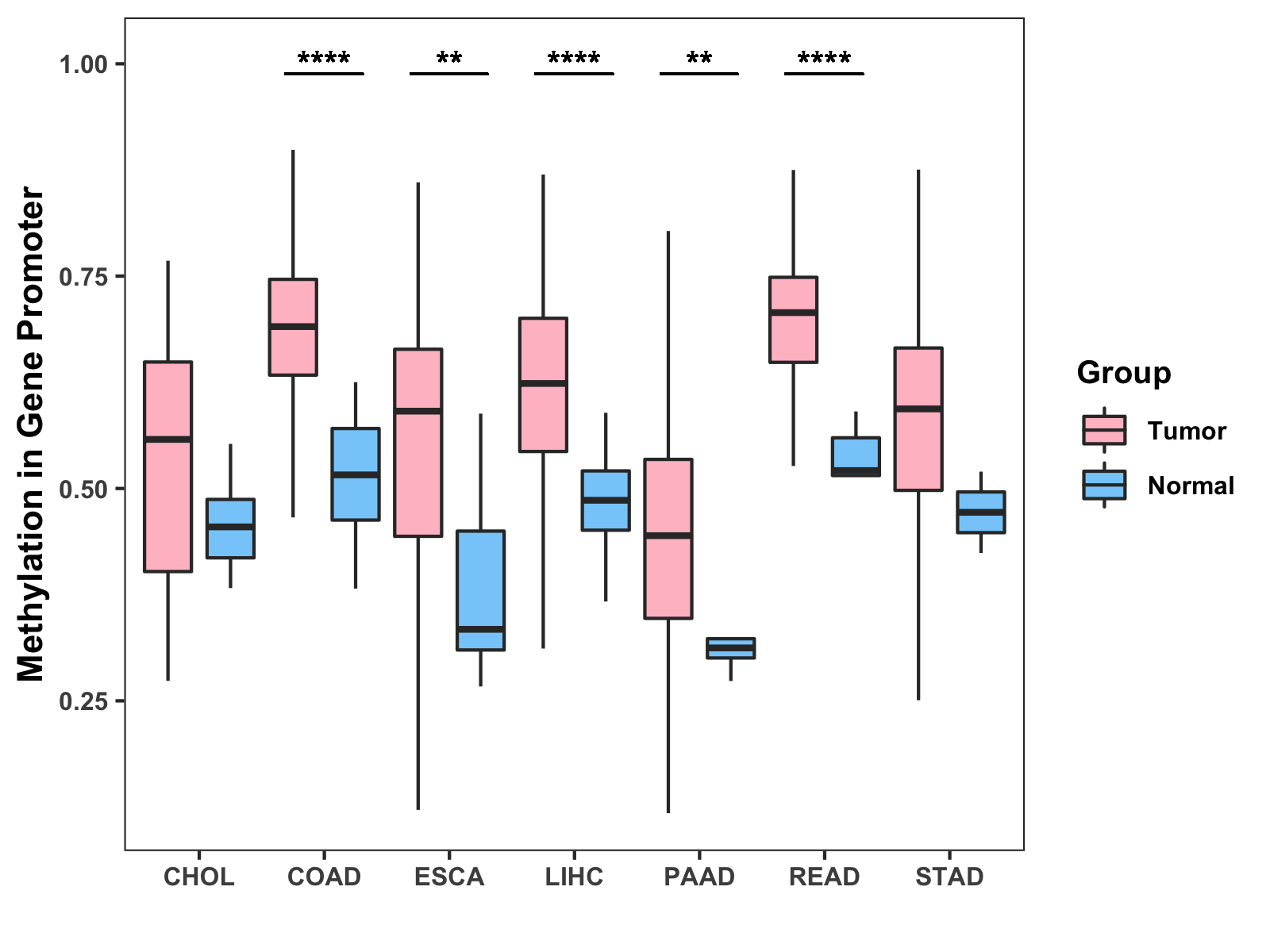 Boxplot of All Gastrointestinal Cancer ( * : 0.01-0.05 , ** : 0.005-0.01 , *** : 0.0001-0.005 , **** : < 0.0001 ) |