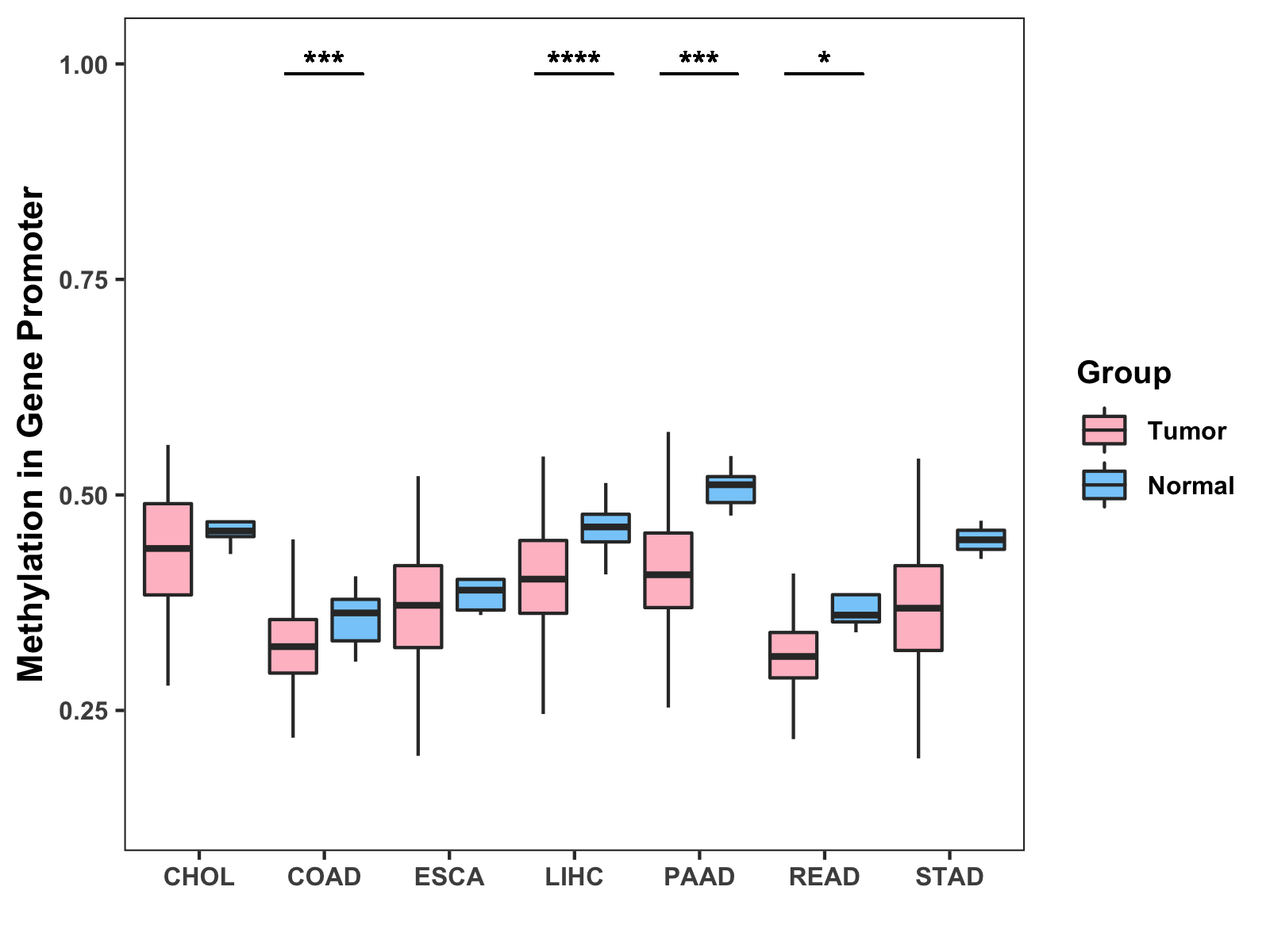 Boxplot of All Gastrointestinal Cancer ( * : 0.01-0.05 , ** : 0.005-0.01 , *** : 0.0001-0.005 , **** : < 0.0001 ) |
