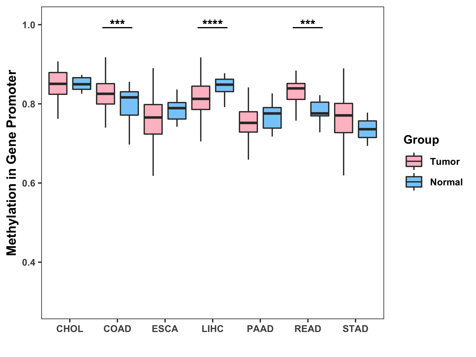 Boxplot of All Gastrointestinal Cancer ( * : 0.01-0.05 , ** : 0.005-0.01 , *** : 0.0001-0.005 , **** : < 0.0001 ) |