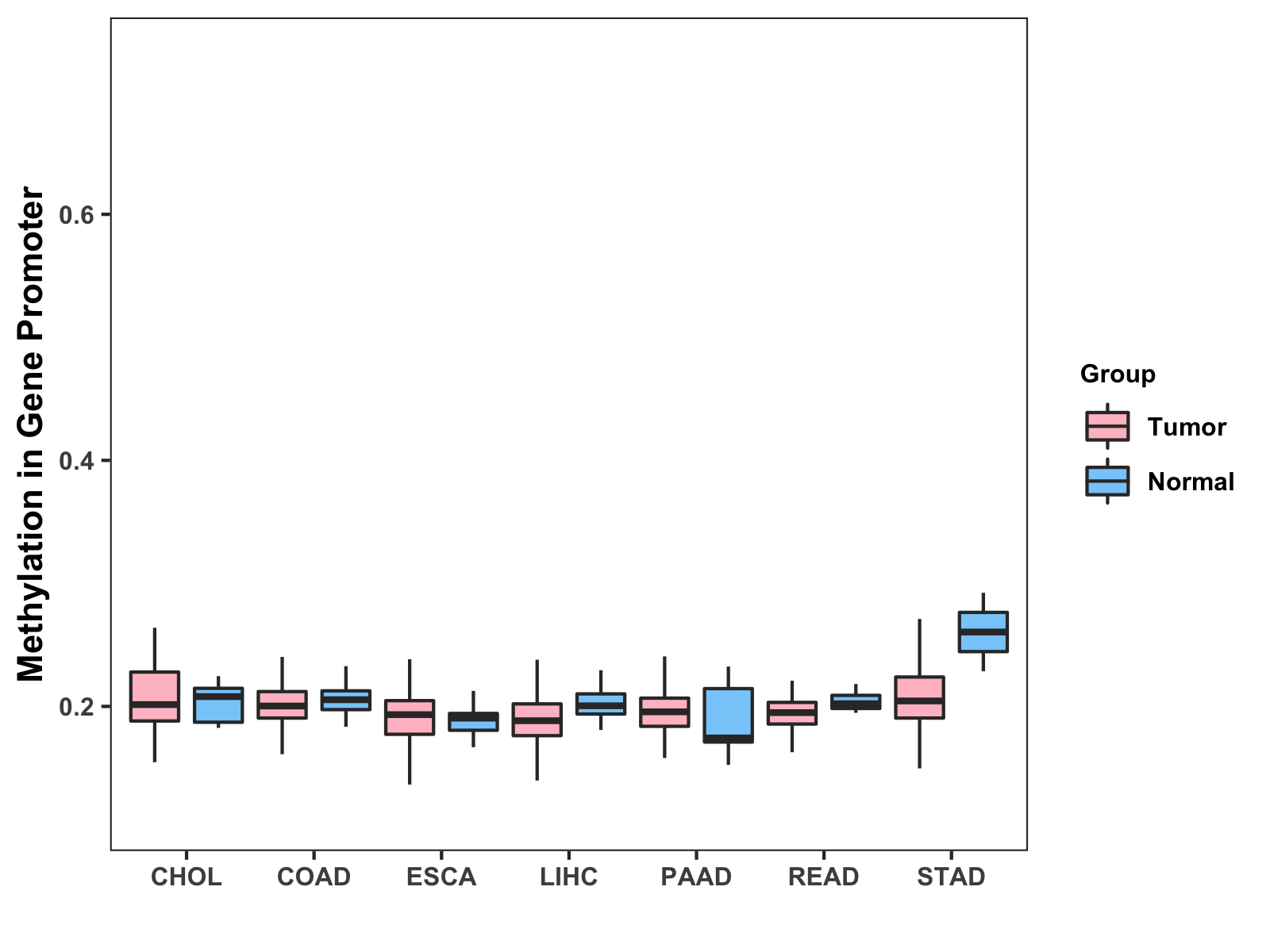 Boxplot of All Gastrointestinal Cancer ( * : 0.01-0.05 , ** : 0.005-0.01 , *** : 0.0001-0.005 , **** : < 0.0001 ) |