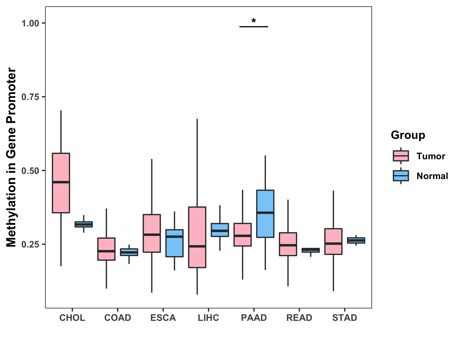 Boxplot of All Gastrointestinal Cancer ( * : 0.01-0.05 , ** : 0.005-0.01 , *** : 0.0001-0.005 , **** : < 0.0001 ) |