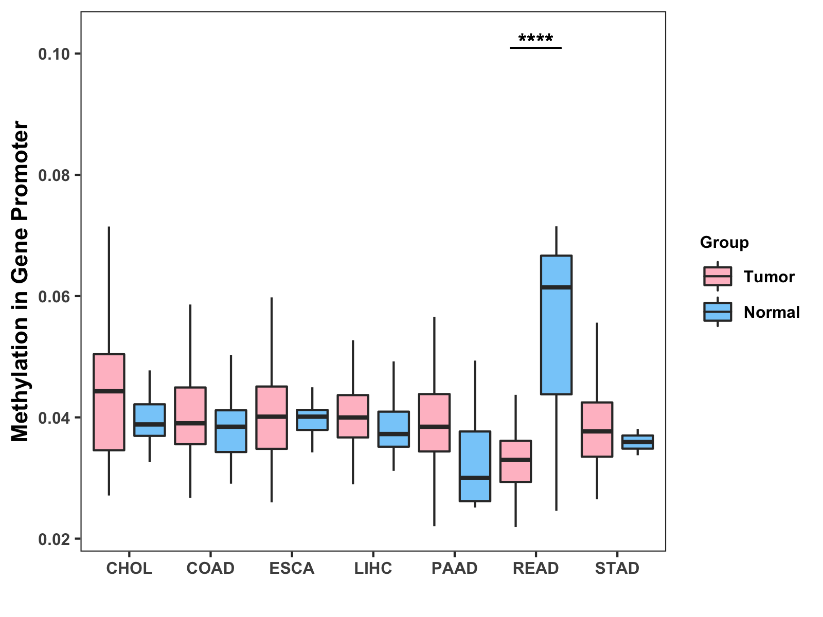 Boxplot of All Gastrointestinal Cancer ( * : 0.01-0.05 , ** : 0.005-0.01 , *** : 0.0001-0.005 , **** : < 0.0001 ) |