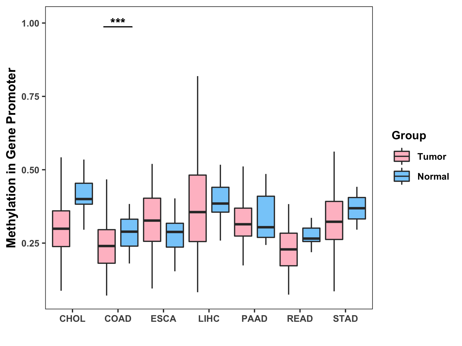 Boxplot of All Gastrointestinal Cancer ( * : 0.01-0.05 , ** : 0.005-0.01 , *** : 0.0001-0.005 , **** : < 0.0001 ) |