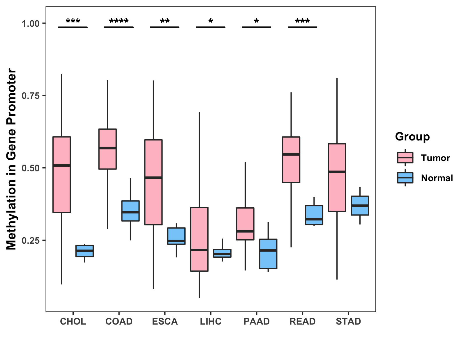 Boxplot of All Gastrointestinal Cancer ( * : 0.01-0.05 , ** : 0.005-0.01 , *** : 0.0001-0.005 , **** : < 0.0001 ) |