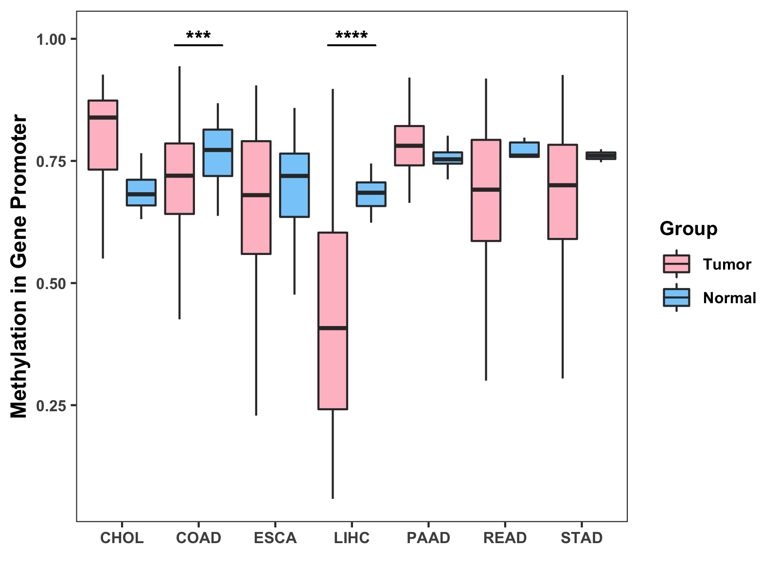 Boxplot of All Gastrointestinal Cancer ( * : 0.01-0.05 , ** : 0.005-0.01 , *** : 0.0001-0.005 , **** : < 0.0001 ) |