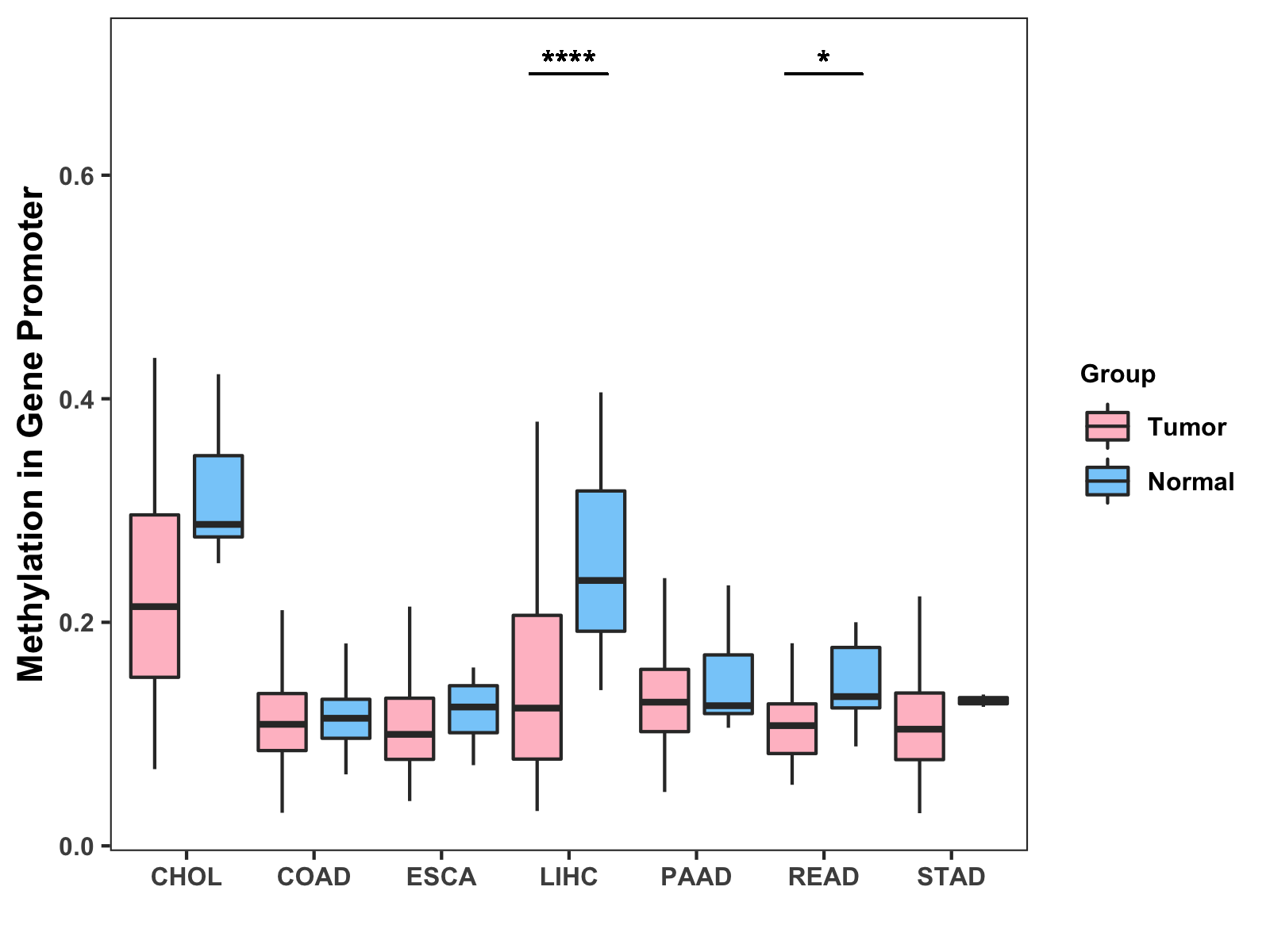 Boxplot of All Gastrointestinal Cancer ( * : 0.01-0.05 , ** : 0.005-0.01 , *** : 0.0001-0.005 , **** : < 0.0001 ) |