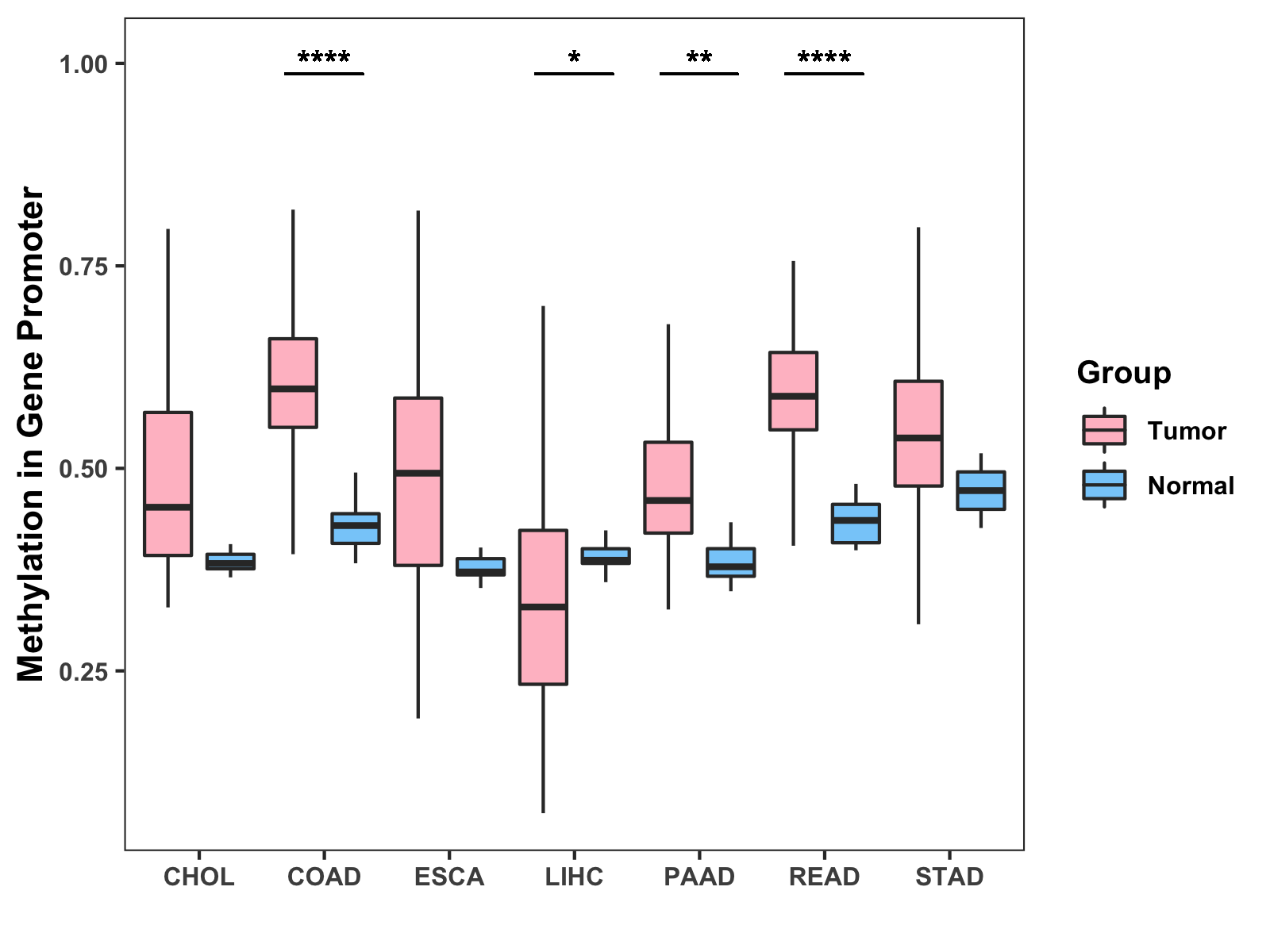 Boxplot of All Gastrointestinal Cancer ( * : 0.01-0.05 , ** : 0.005-0.01 , *** : 0.0001-0.005 , **** : < 0.0001 ) |