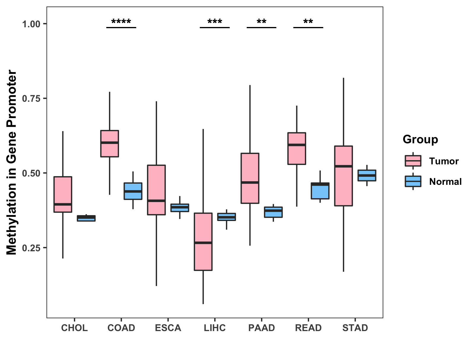 Boxplot of All Gastrointestinal Cancer ( * : 0.01-0.05 , ** : 0.005-0.01 , *** : 0.0001-0.005 , **** : < 0.0001 ) |