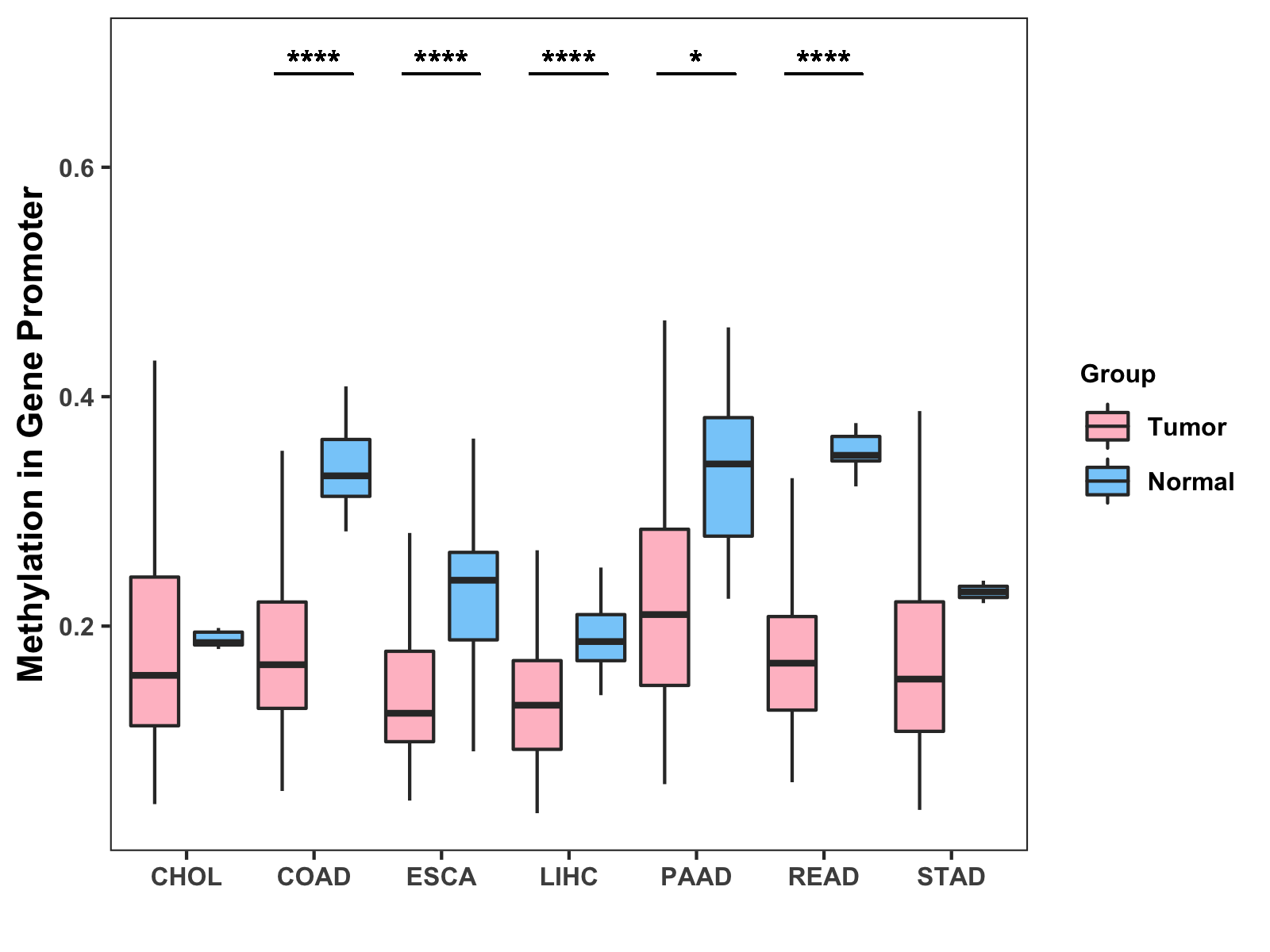 Boxplot of All Gastrointestinal Cancer ( * : 0.01-0.05 , ** : 0.005-0.01 , *** : 0.0001-0.005 , **** : < 0.0001 ) |