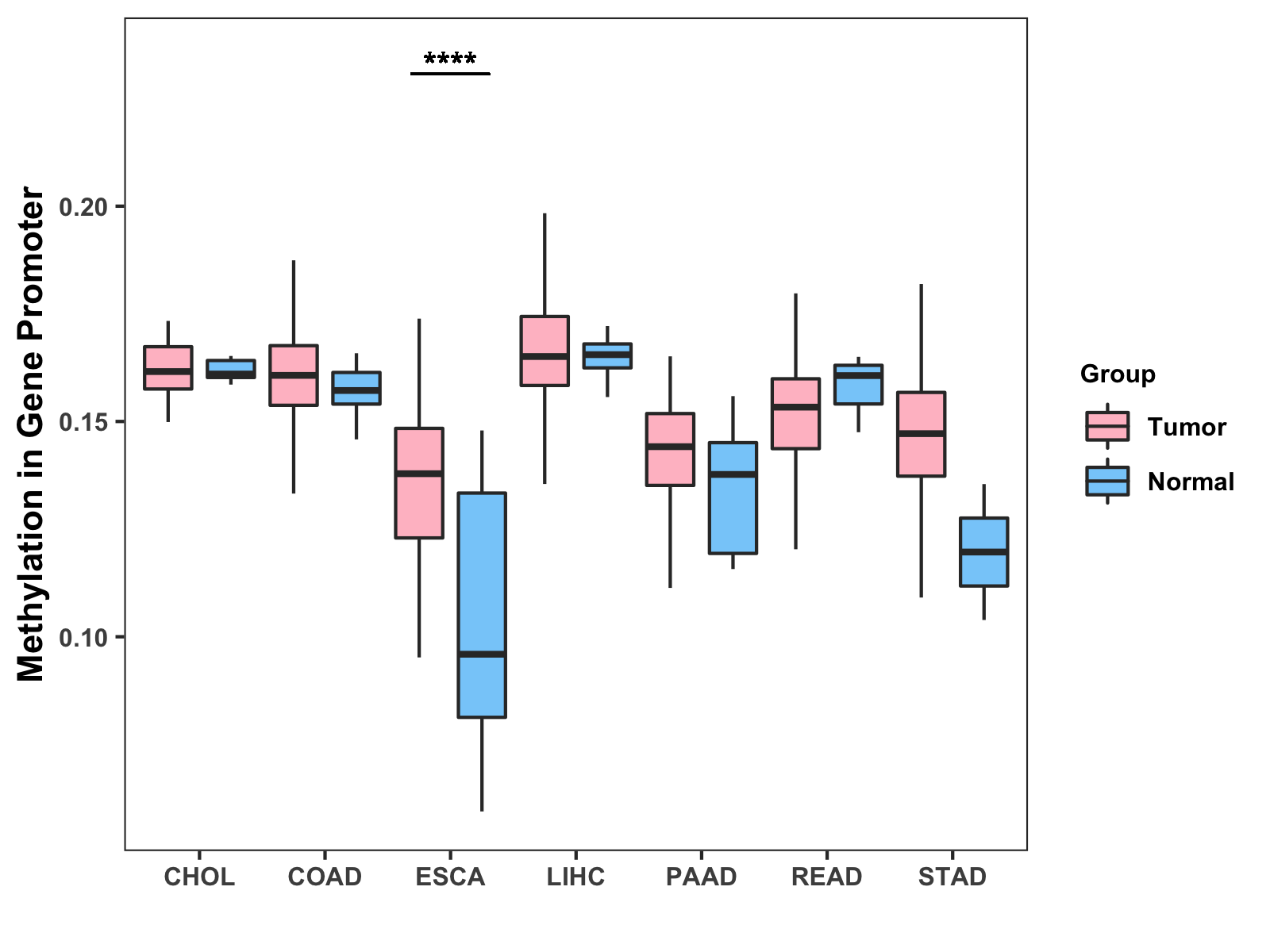 Boxplot of All Gastrointestinal Cancer ( * : 0.01-0.05 , ** : 0.005-0.01 , *** : 0.0001-0.005 , **** : < 0.0001 ) |