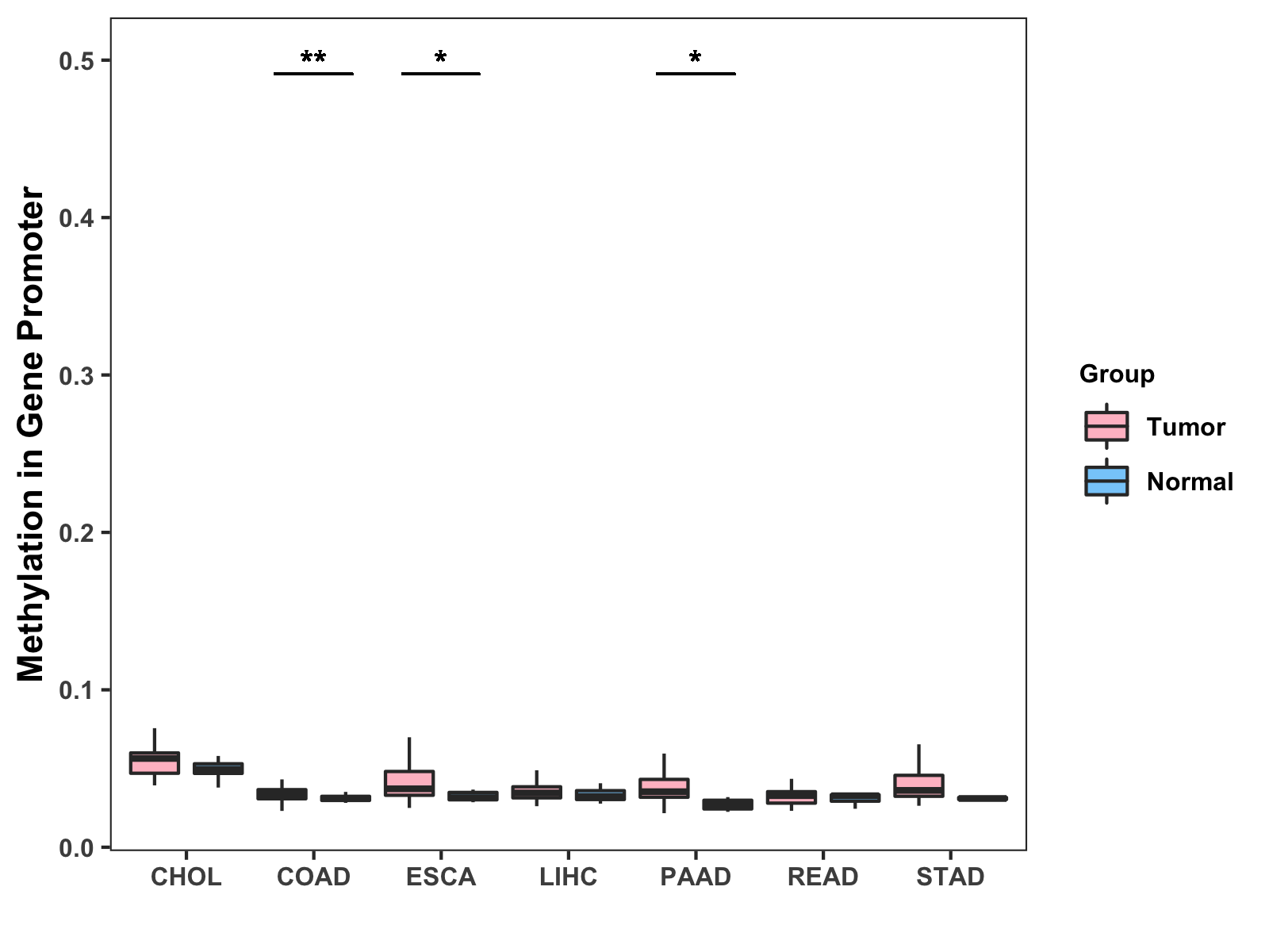 Boxplot of All Gastrointestinal Cancer ( * : 0.01-0.05 , ** : 0.005-0.01 , *** : 0.0001-0.005 , **** : < 0.0001 ) |