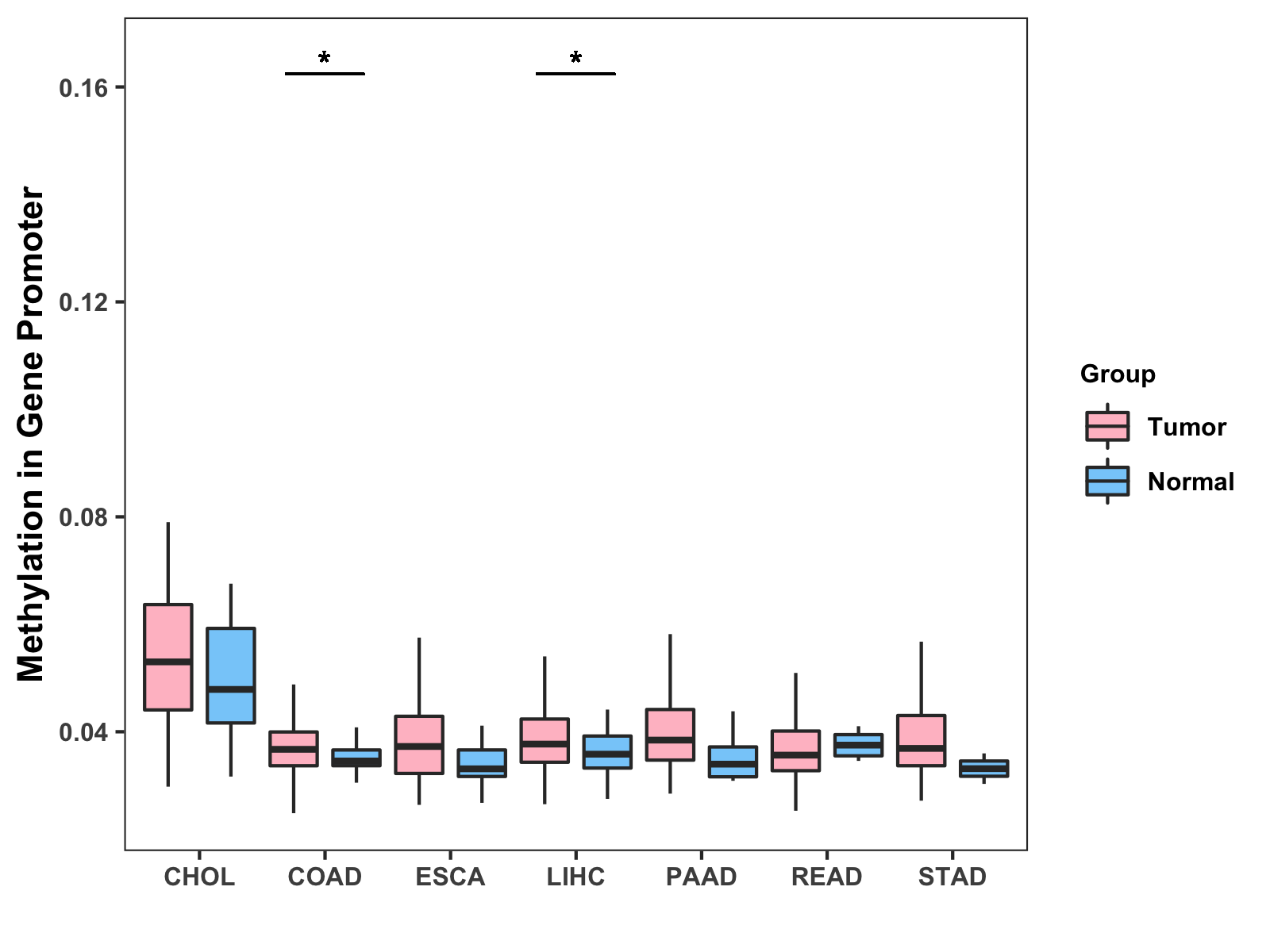 Boxplot of All Gastrointestinal Cancer ( * : 0.01-0.05 , ** : 0.005-0.01 , *** : 0.0001-0.005 , **** : < 0.0001 ) |