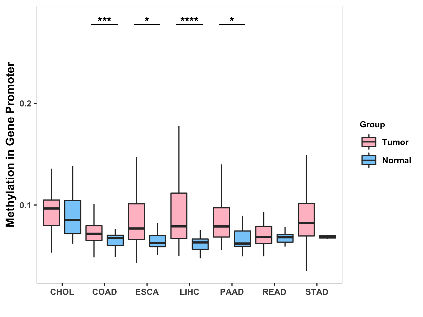 Boxplot of All Gastrointestinal Cancer ( * : 0.01-0.05 , ** : 0.005-0.01 , *** : 0.0001-0.005 , **** : < 0.0001 ) |