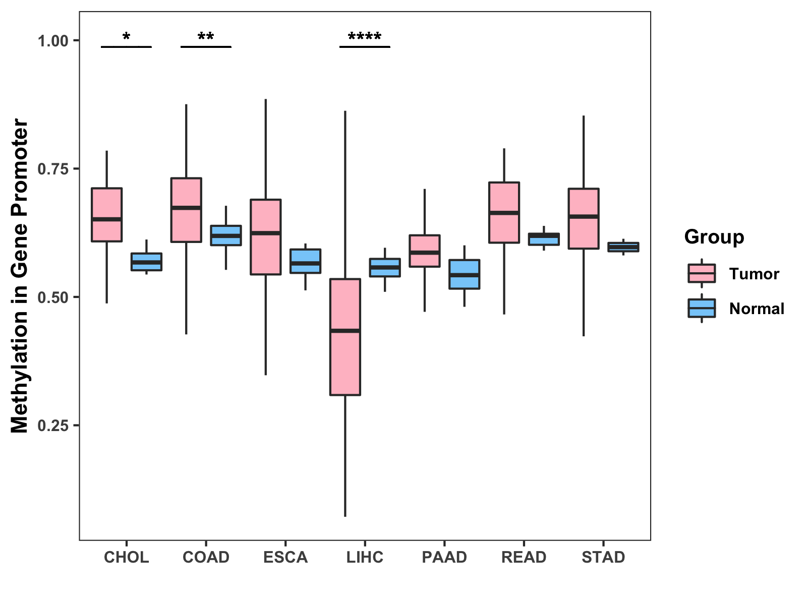Boxplot of All Gastrointestinal Cancer ( * : 0.01-0.05 , ** : 0.005-0.01 , *** : 0.0001-0.005 , **** : < 0.0001 ) |