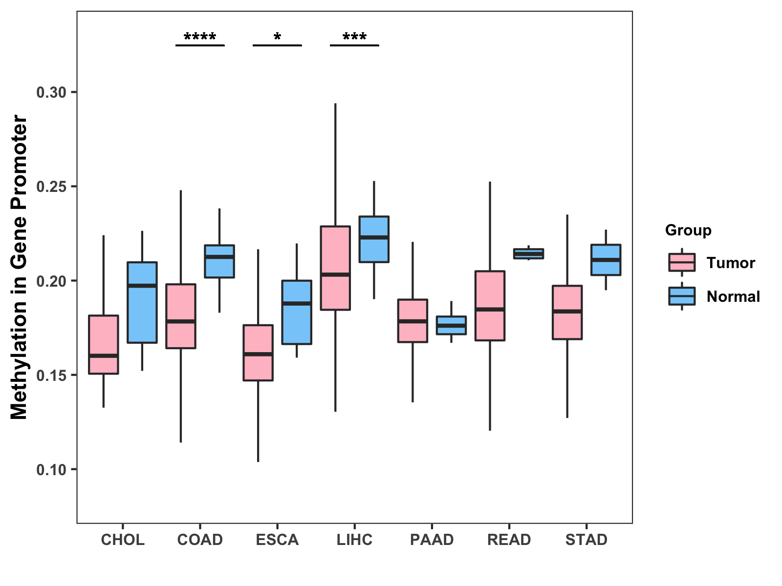 Boxplot of All Gastrointestinal Cancer ( * : 0.01-0.05 , ** : 0.005-0.01 , *** : 0.0001-0.005 , **** : < 0.0001 ) |