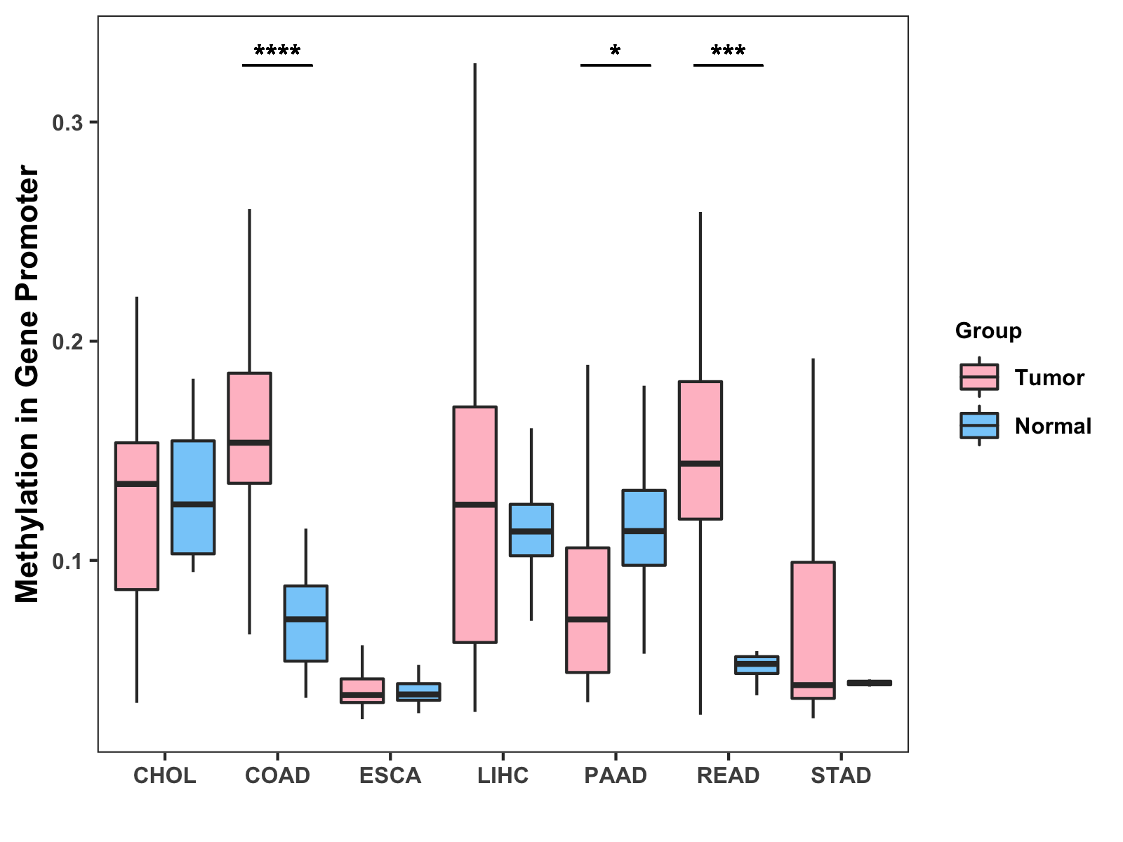 Boxplot of All Gastrointestinal Cancer ( * : 0.01-0.05 , ** : 0.005-0.01 , *** : 0.0001-0.005 , **** : < 0.0001 ) |