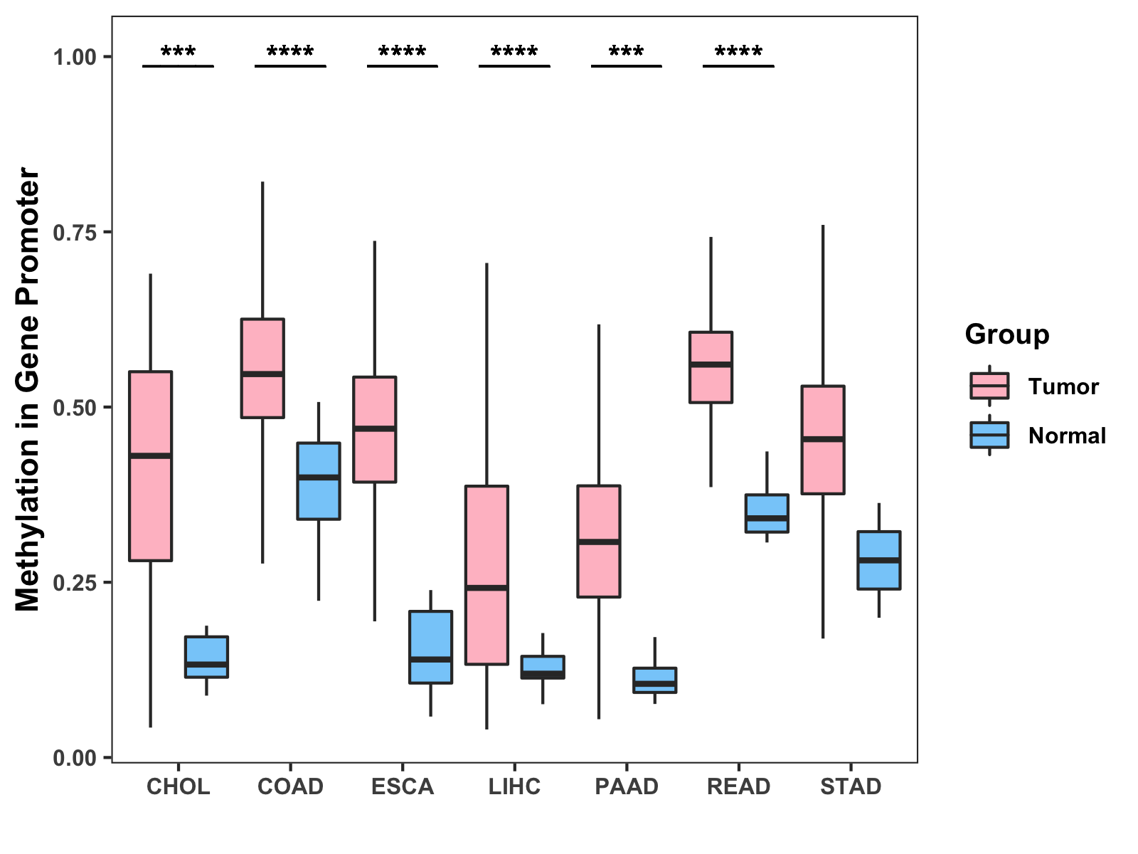 Boxplot of All Gastrointestinal Cancer ( * : 0.01-0.05 , ** : 0.005-0.01 , *** : 0.0001-0.005 , **** : < 0.0001 ) |