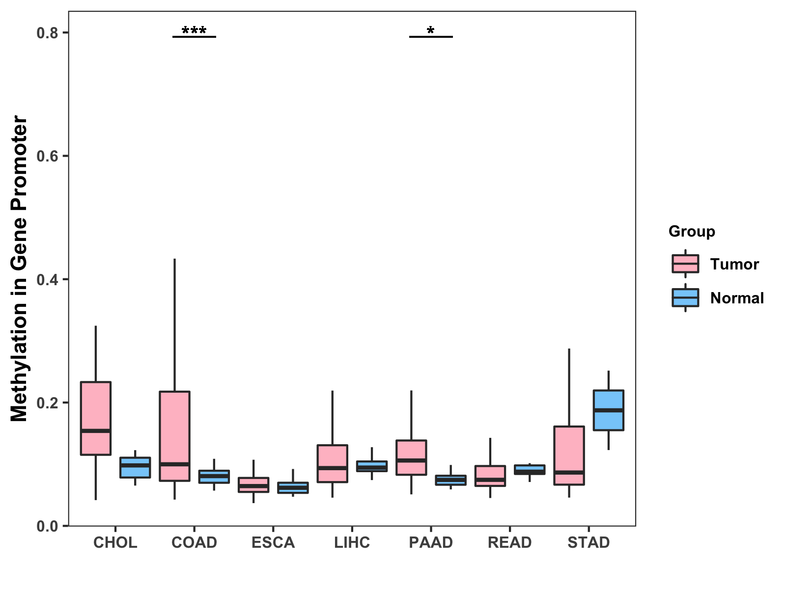Boxplot of All Gastrointestinal Cancer ( * : 0.01-0.05 , ** : 0.005-0.01 , *** : 0.0001-0.005 , **** : < 0.0001 ) |