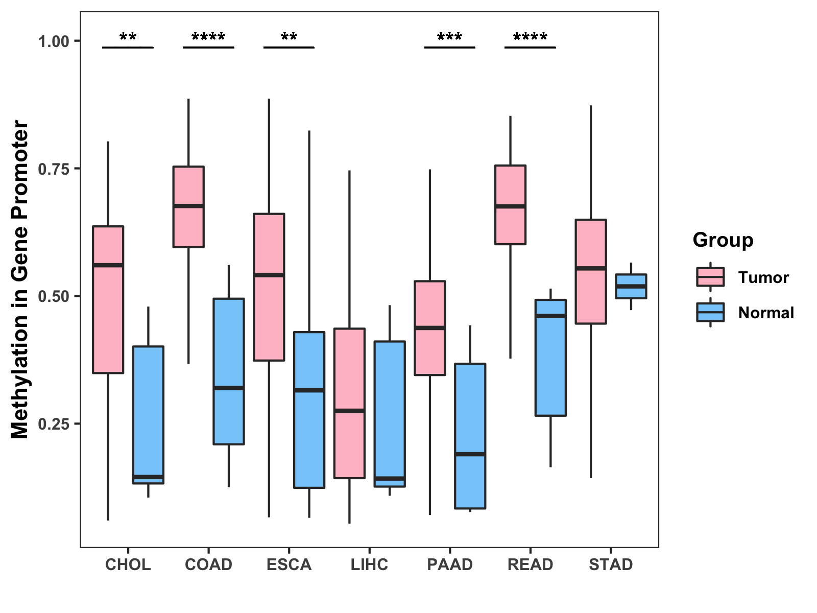 Boxplot of All Gastrointestinal Cancer ( * : 0.01-0.05 , ** : 0.005-0.01 , *** : 0.0001-0.005 , **** : < 0.0001 ) |