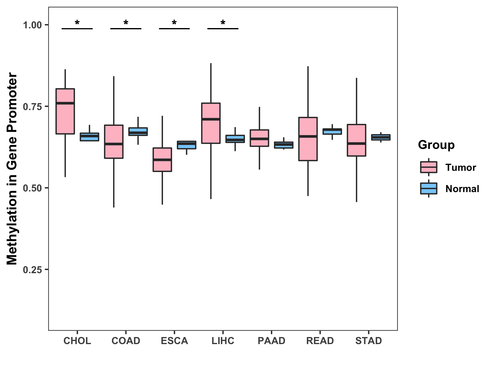 Boxplot of All Gastrointestinal Cancer ( * : 0.01-0.05 , ** : 0.005-0.01 , *** : 0.0001-0.005 , **** : < 0.0001 ) |