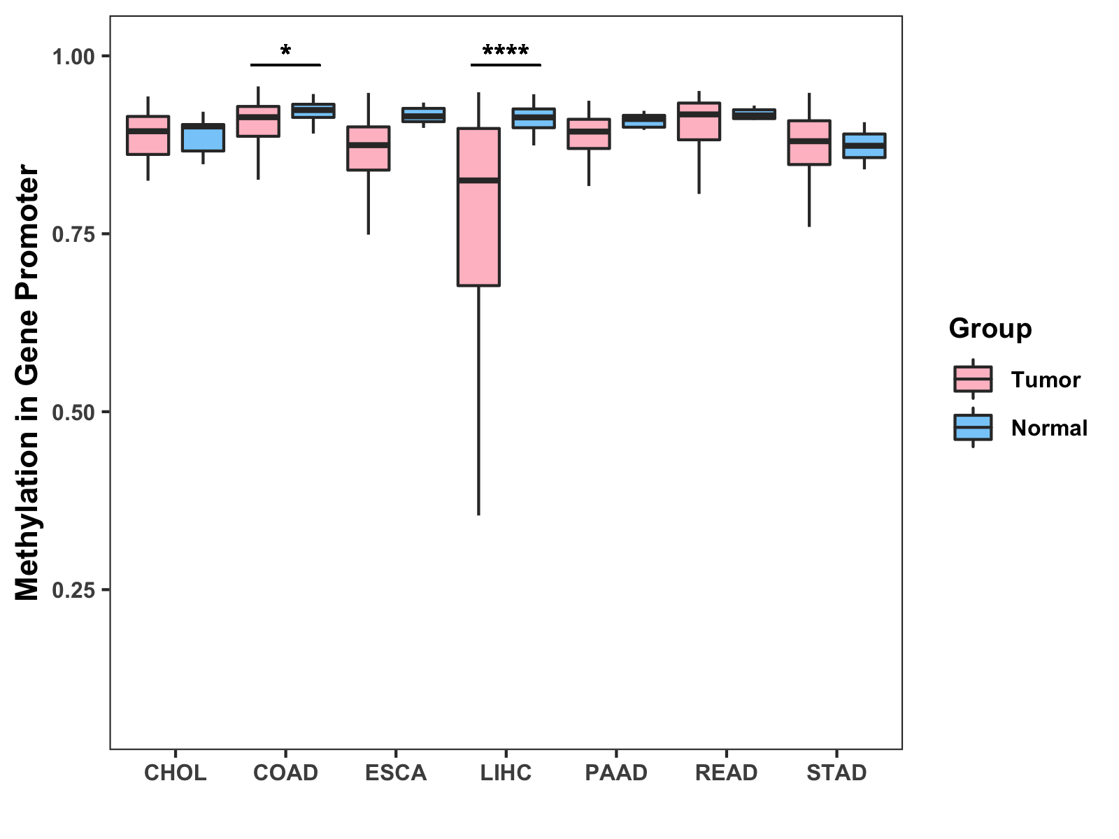 Boxplot of All Gastrointestinal Cancer ( * : 0.01-0.05 , ** : 0.005-0.01 , *** : 0.0001-0.005 , **** : < 0.0001 ) |