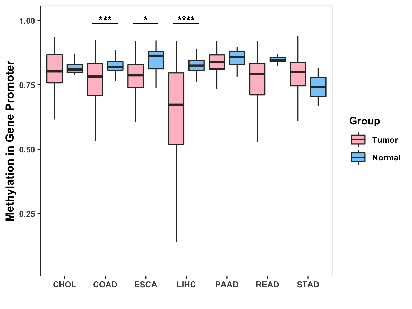 Boxplot of All Gastrointestinal Cancer ( * : 0.01-0.05 , ** : 0.005-0.01 , *** : 0.0001-0.005 , **** : < 0.0001 ) |