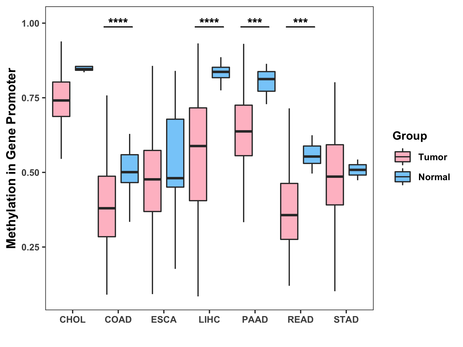 Boxplot of All Gastrointestinal Cancer ( * : 0.01-0.05 , ** : 0.005-0.01 , *** : 0.0001-0.005 , **** : < 0.0001 ) |