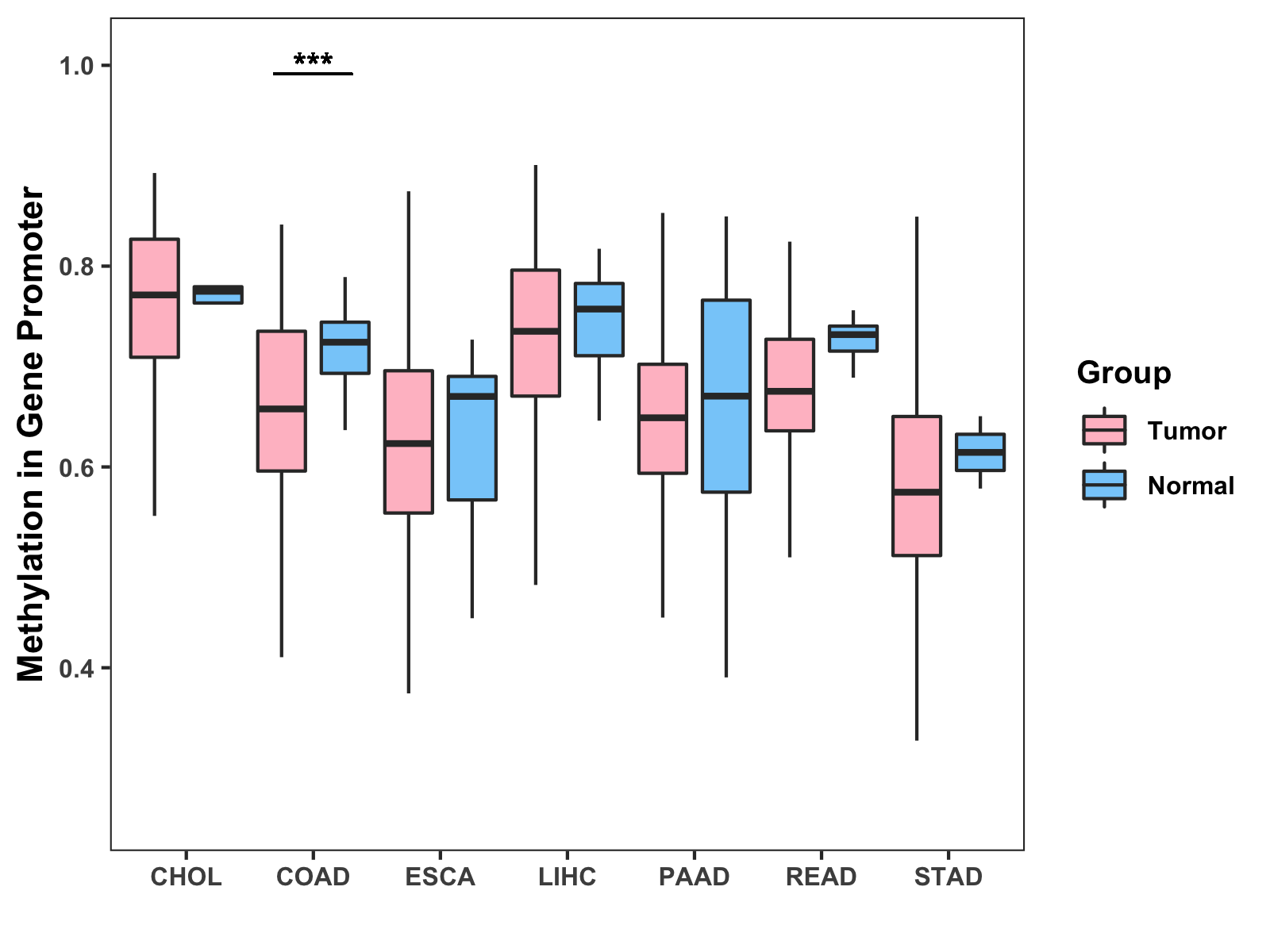 Boxplot of All Gastrointestinal Cancer ( * : 0.01-0.05 , ** : 0.005-0.01 , *** : 0.0001-0.005 , **** : < 0.0001 ) |