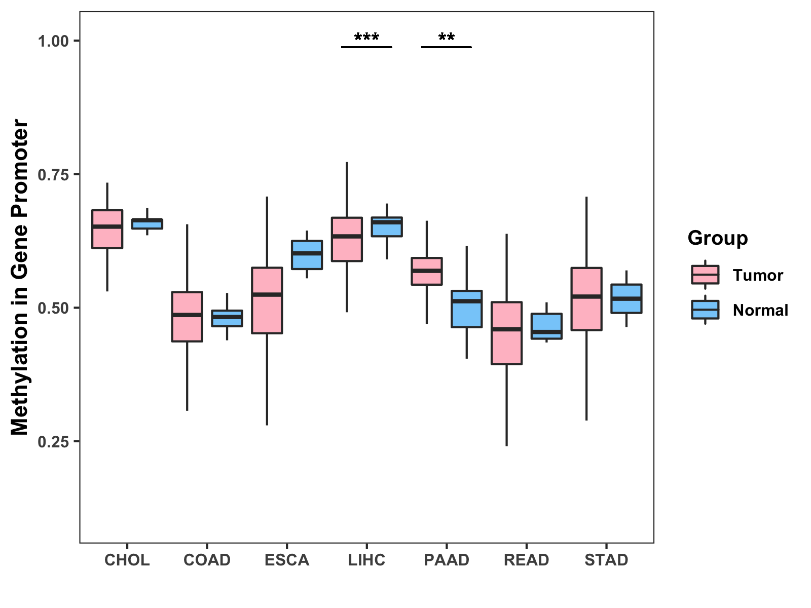 Boxplot of All Gastrointestinal Cancer ( * : 0.01-0.05 , ** : 0.005-0.01 , *** : 0.0001-0.005 , **** : < 0.0001 ) |