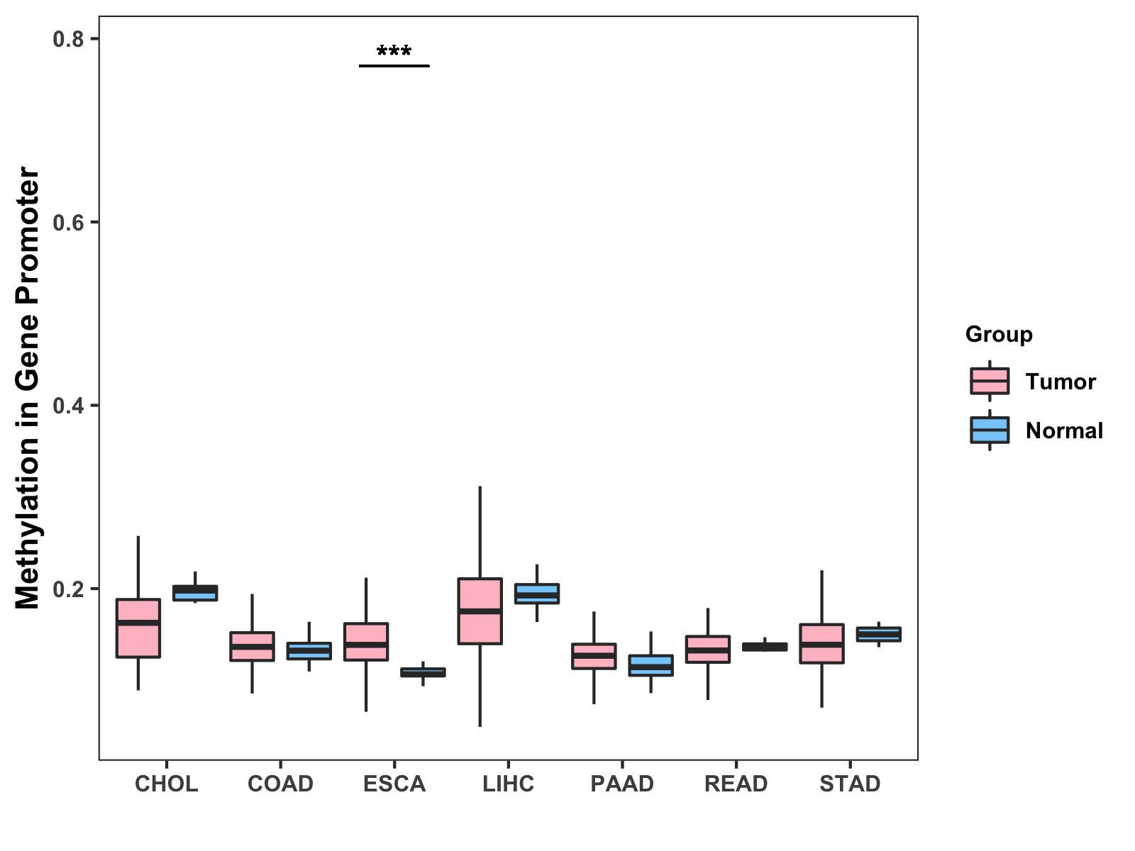 Boxplot of All Gastrointestinal Cancer ( * : 0.01-0.05 , ** : 0.005-0.01 , *** : 0.0001-0.005 , **** : < 0.0001 ) |