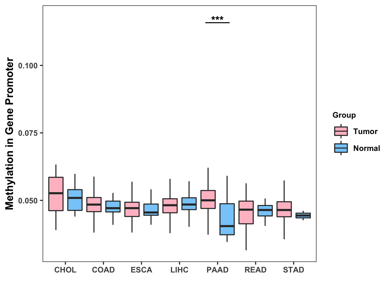 Boxplot of All Gastrointestinal Cancer ( * : 0.01-0.05 , ** : 0.005-0.01 , *** : 0.0001-0.005 , **** : < 0.0001 ) |