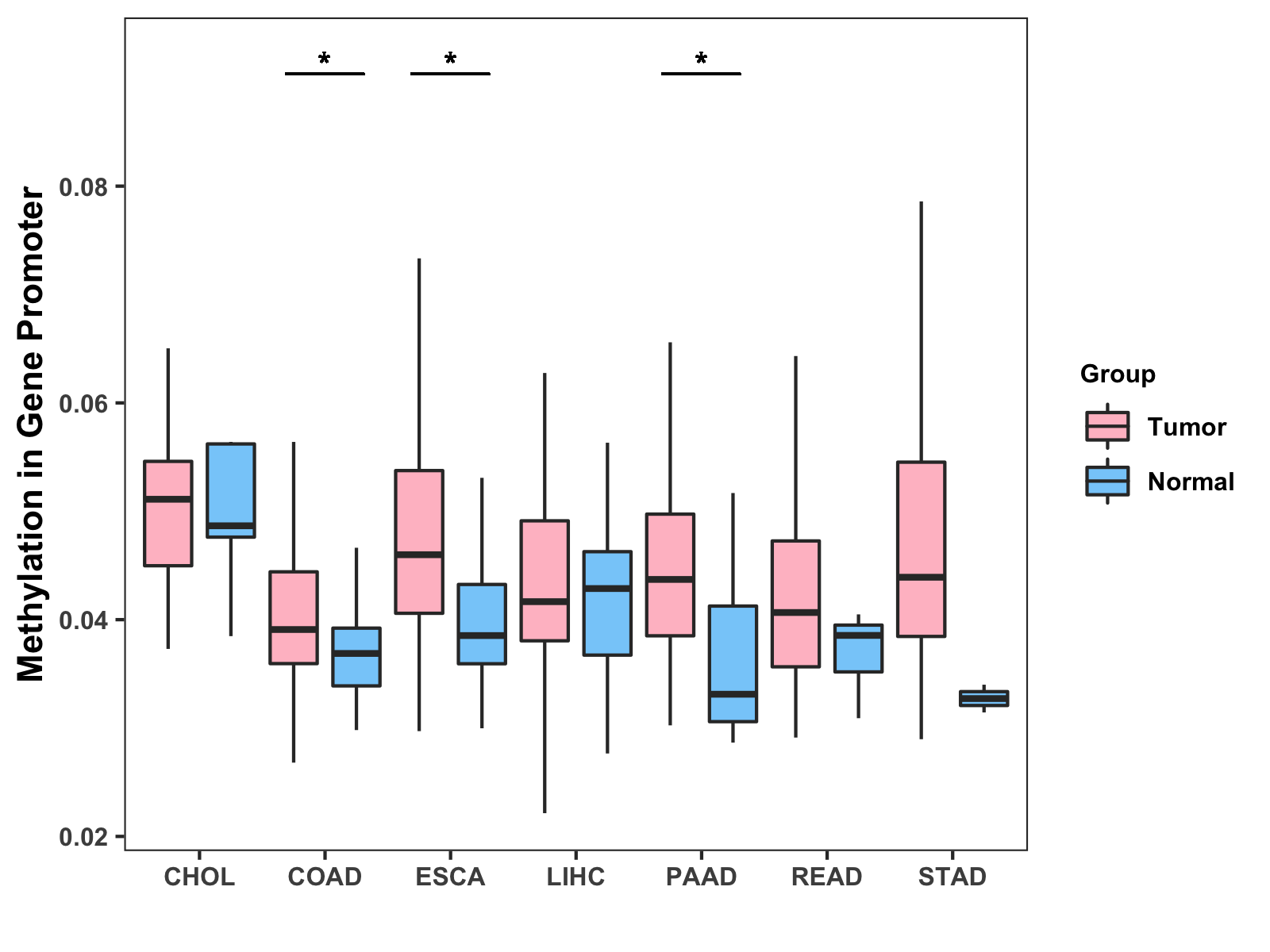 Boxplot of All Gastrointestinal Cancer ( * : 0.01-0.05 , ** : 0.005-0.01 , *** : 0.0001-0.005 , **** : < 0.0001 ) |