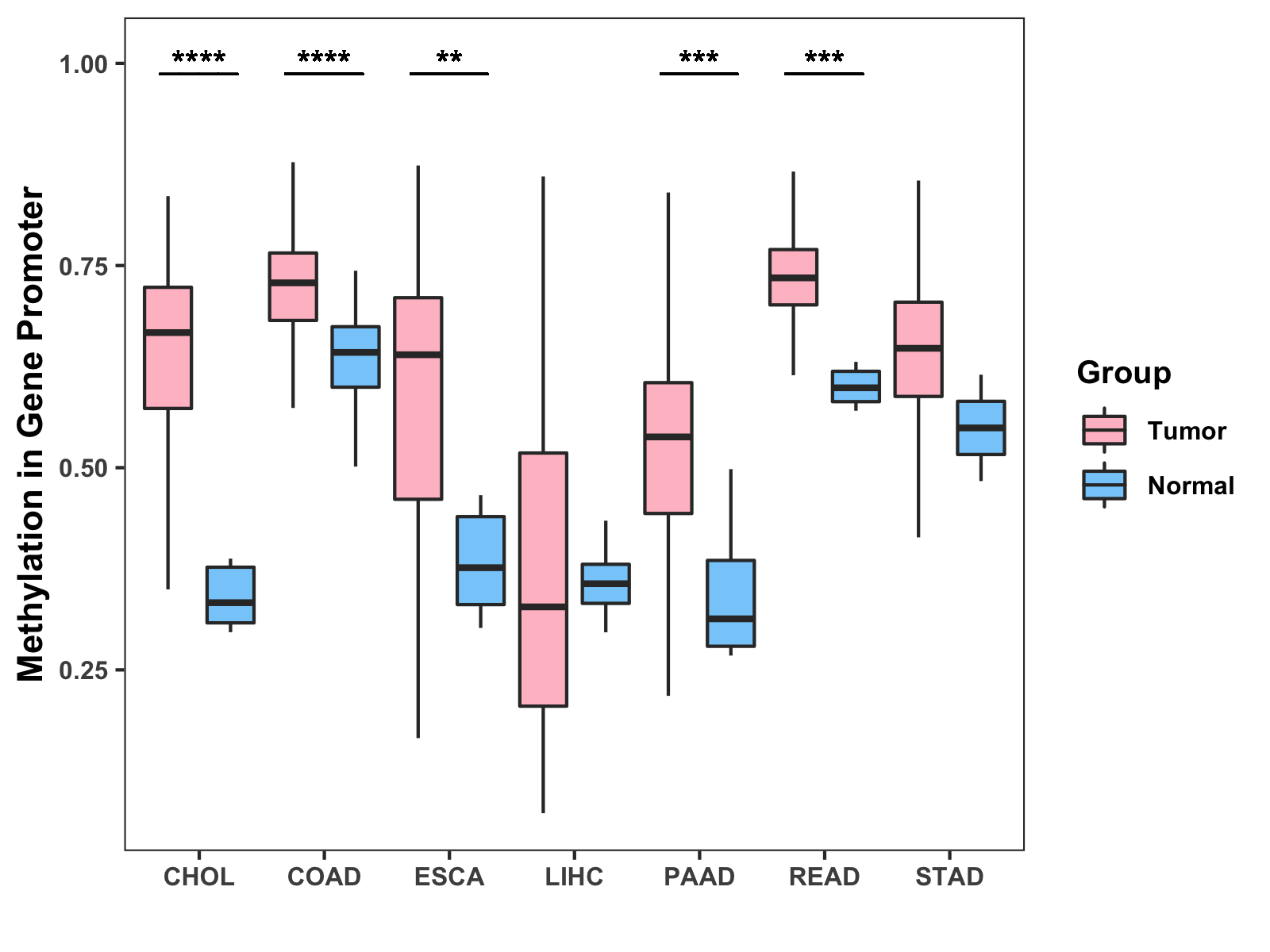 Boxplot of All Gastrointestinal Cancer ( * : 0.01-0.05 , ** : 0.005-0.01 , *** : 0.0001-0.005 , **** : < 0.0001 ) |