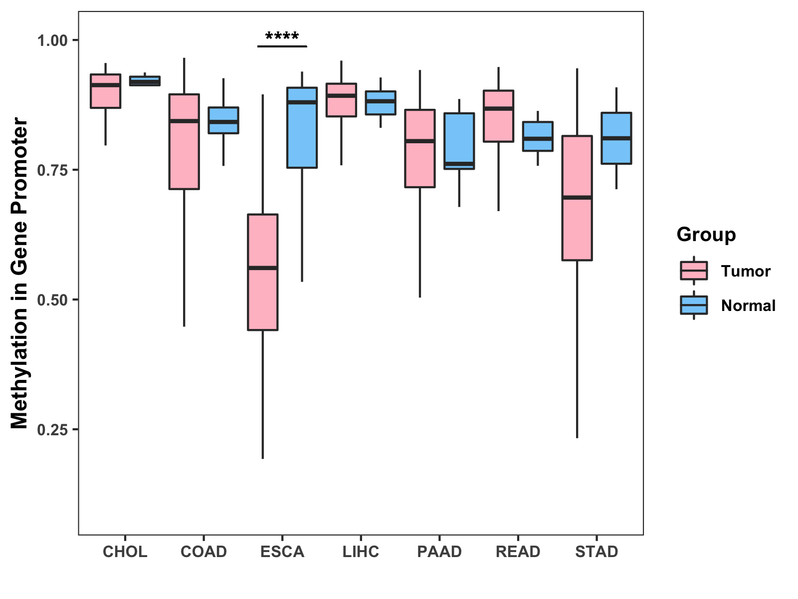Boxplot of All Gastrointestinal Cancer ( * : 0.01-0.05 , ** : 0.005-0.01 , *** : 0.0001-0.005 , **** : < 0.0001 ) |