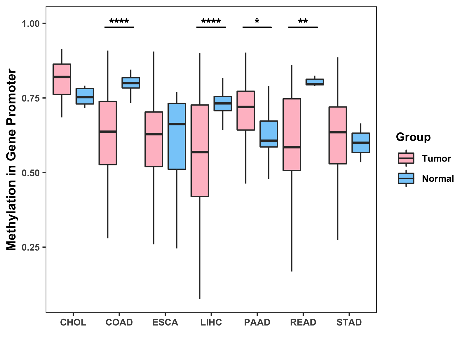 Boxplot of All Gastrointestinal Cancer ( * : 0.01-0.05 , ** : 0.005-0.01 , *** : 0.0001-0.005 , **** : < 0.0001 ) |