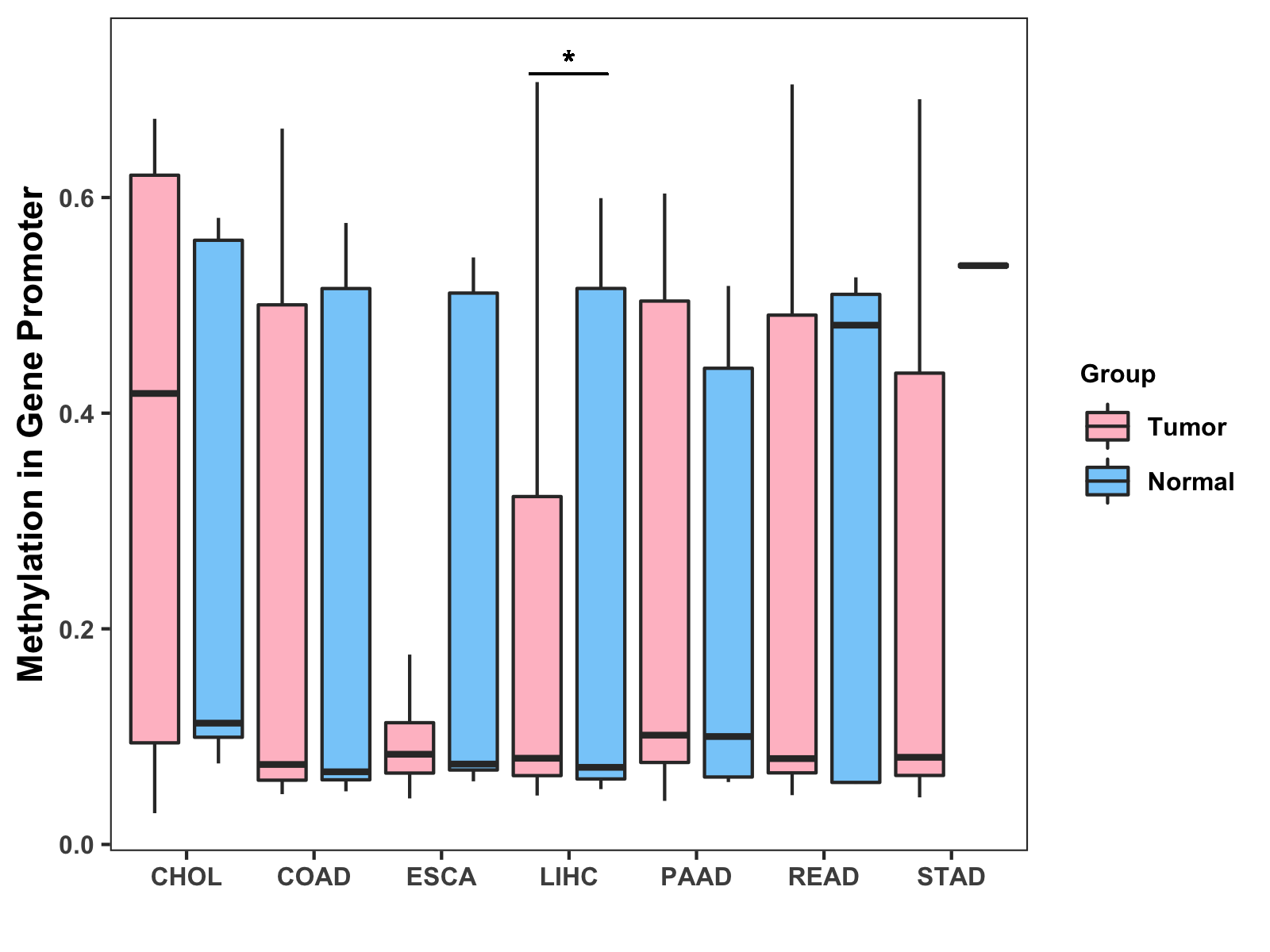 Boxplot of All Gastrointestinal Cancer ( * : 0.01-0.05 , ** : 0.005-0.01 , *** : 0.0001-0.005 , **** : < 0.0001 ) |