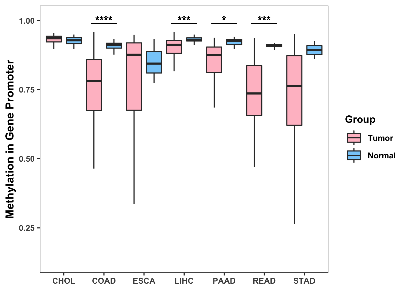 Boxplot of All Gastrointestinal Cancer ( * : 0.01-0.05 , ** : 0.005-0.01 , *** : 0.0001-0.005 , **** : < 0.0001 ) |