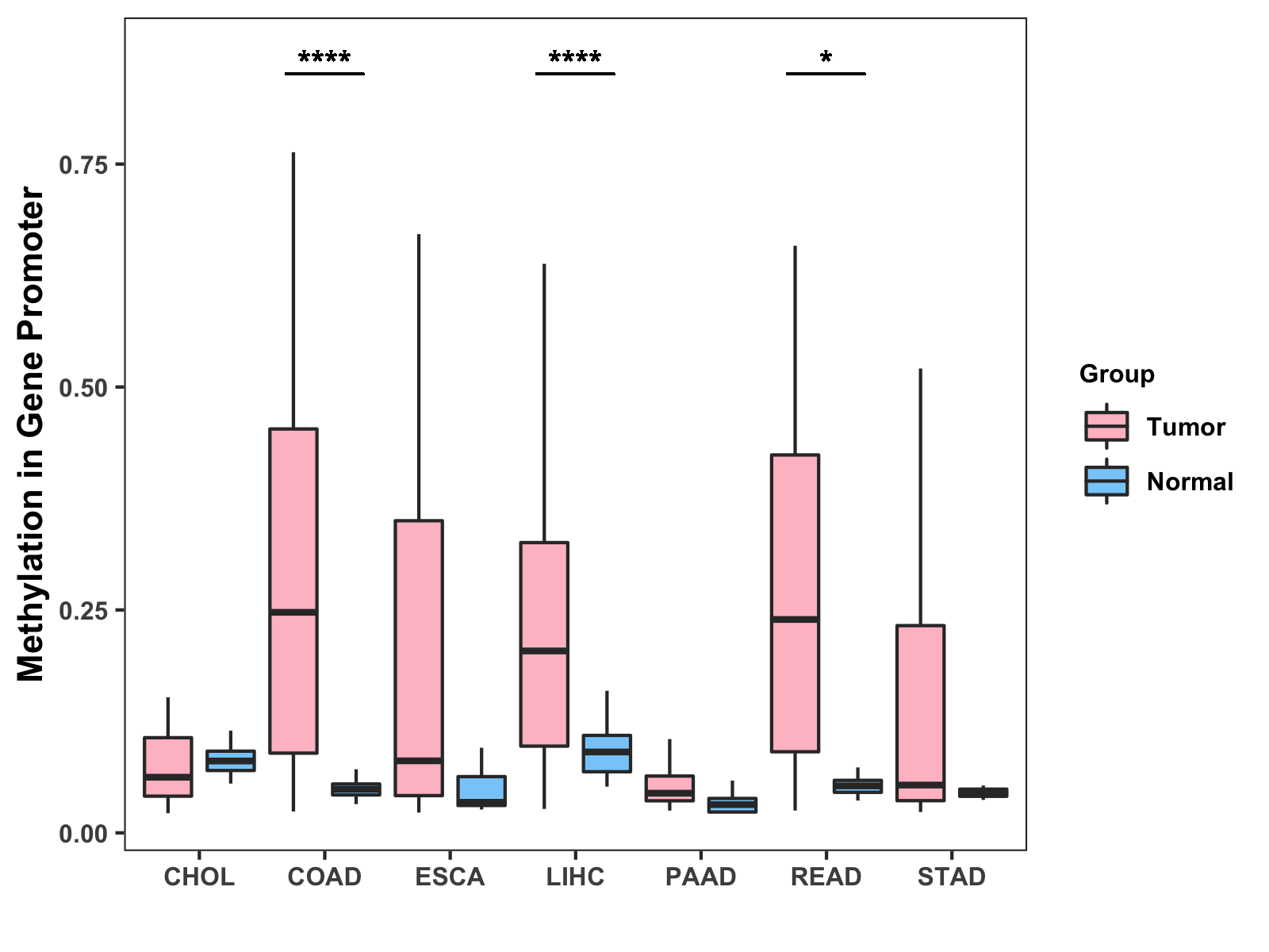 Boxplot of All Gastrointestinal Cancer ( * : 0.01-0.05 , ** : 0.005-0.01 , *** : 0.0001-0.005 , **** : < 0.0001 ) |