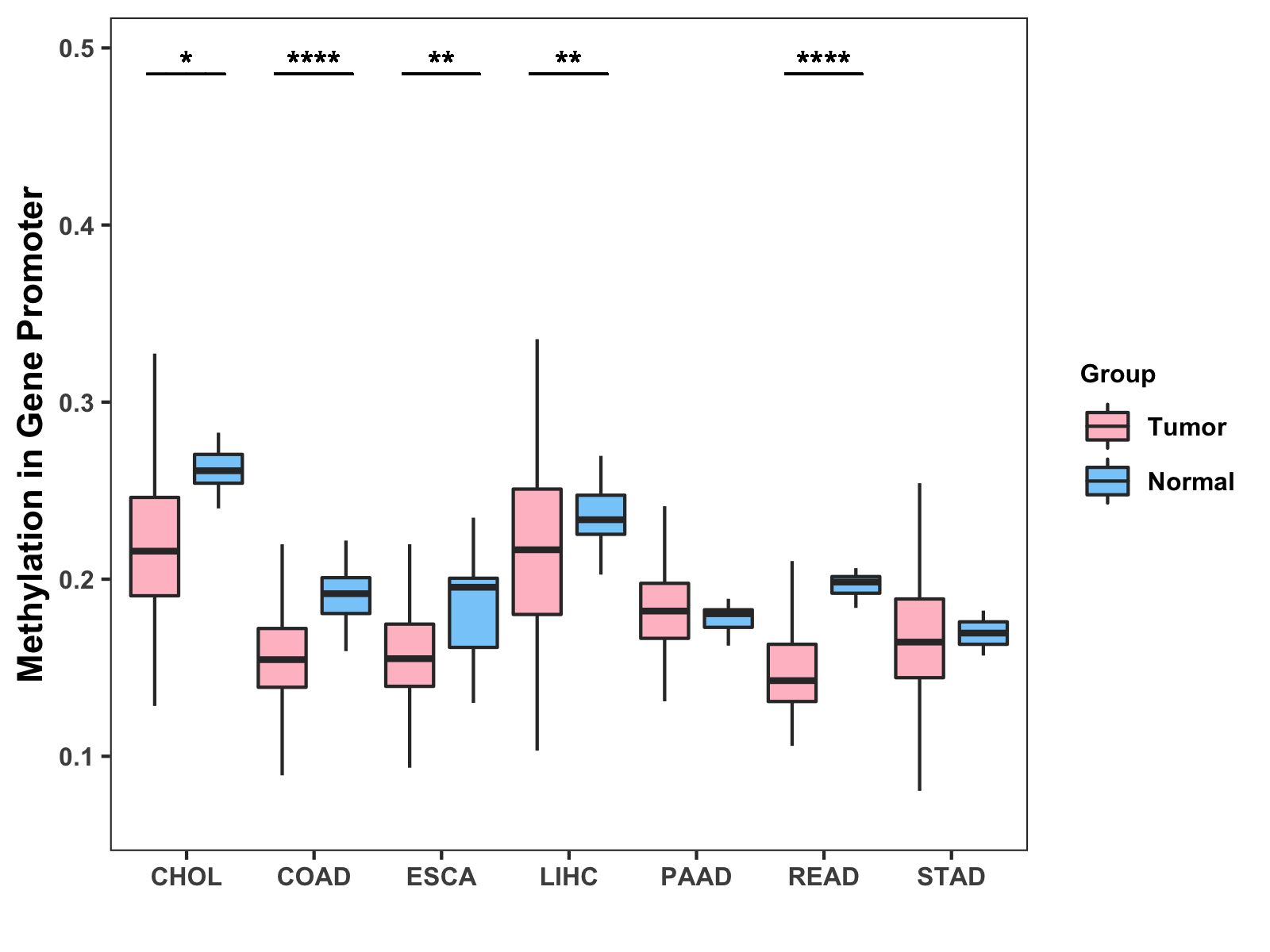 Boxplot of All Gastrointestinal Cancer ( * : 0.01-0.05 , ** : 0.005-0.01 , *** : 0.0001-0.005 , **** : < 0.0001 ) |