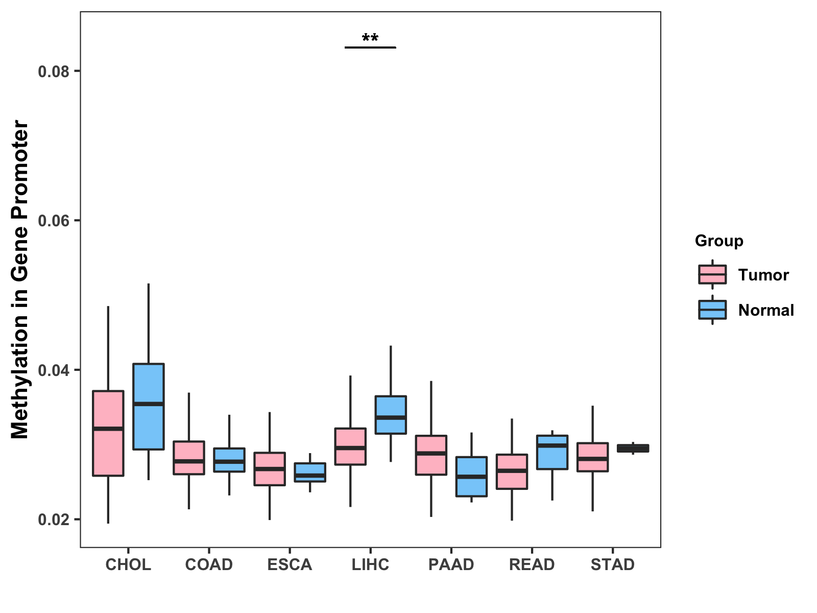 Boxplot of All Gastrointestinal Cancer ( * : 0.01-0.05 , ** : 0.005-0.01 , *** : 0.0001-0.005 , **** : < 0.0001 ) |