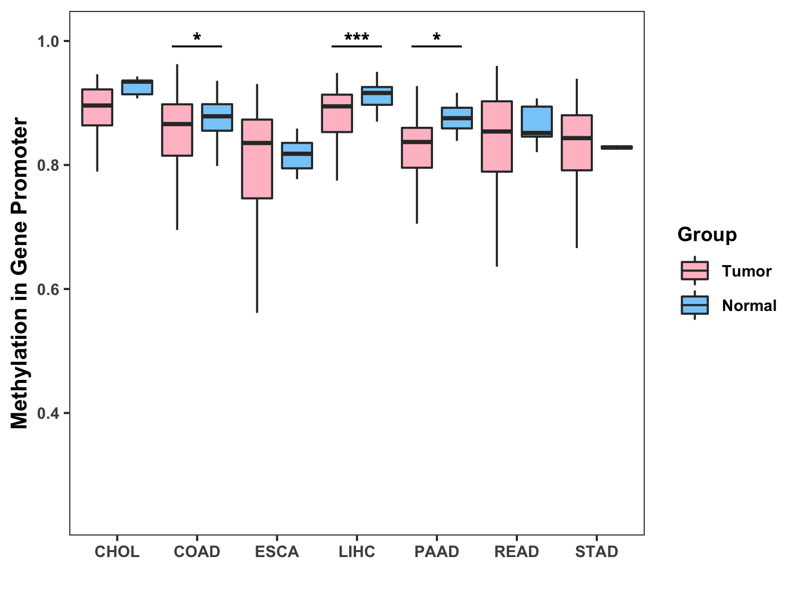 Boxplot of All Gastrointestinal Cancer ( * : 0.01-0.05 , ** : 0.005-0.01 , *** : 0.0001-0.005 , **** : < 0.0001 ) |