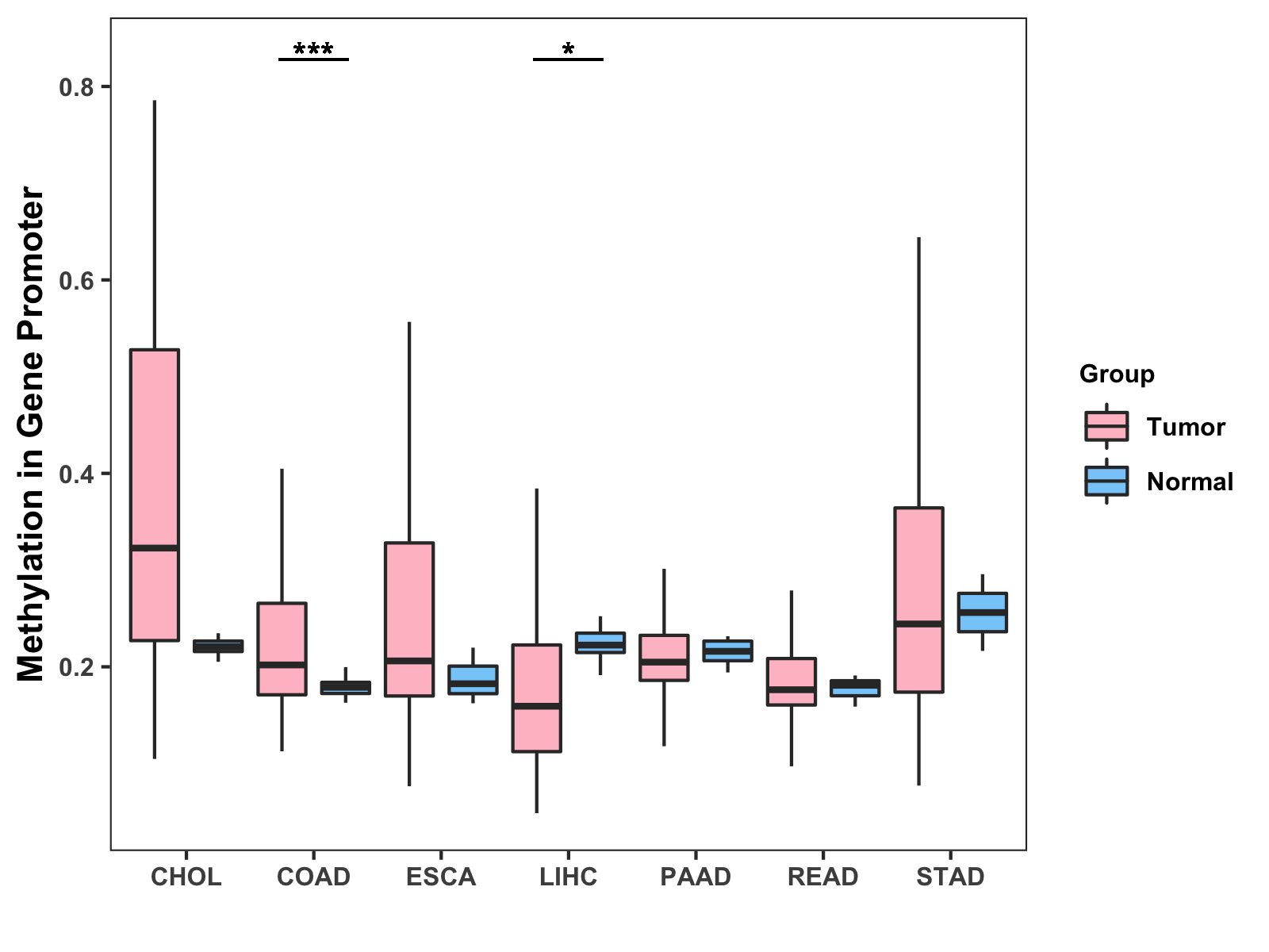 Boxplot of All Gastrointestinal Cancer ( * : 0.01-0.05 , ** : 0.005-0.01 , *** : 0.0001-0.005 , **** : < 0.0001 ) |